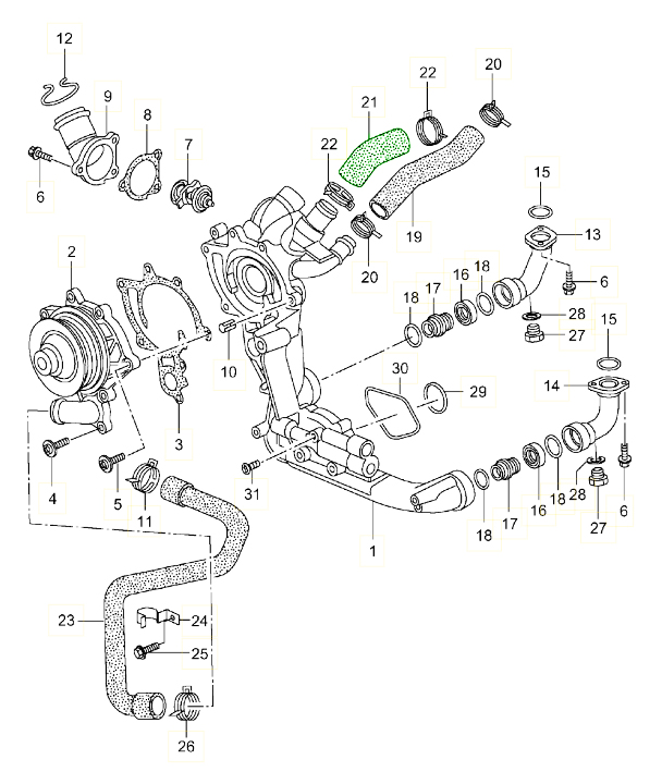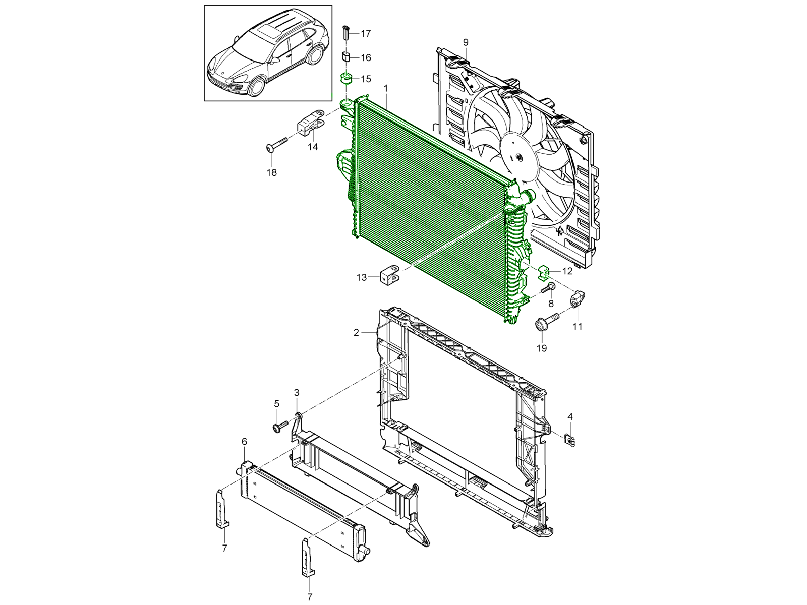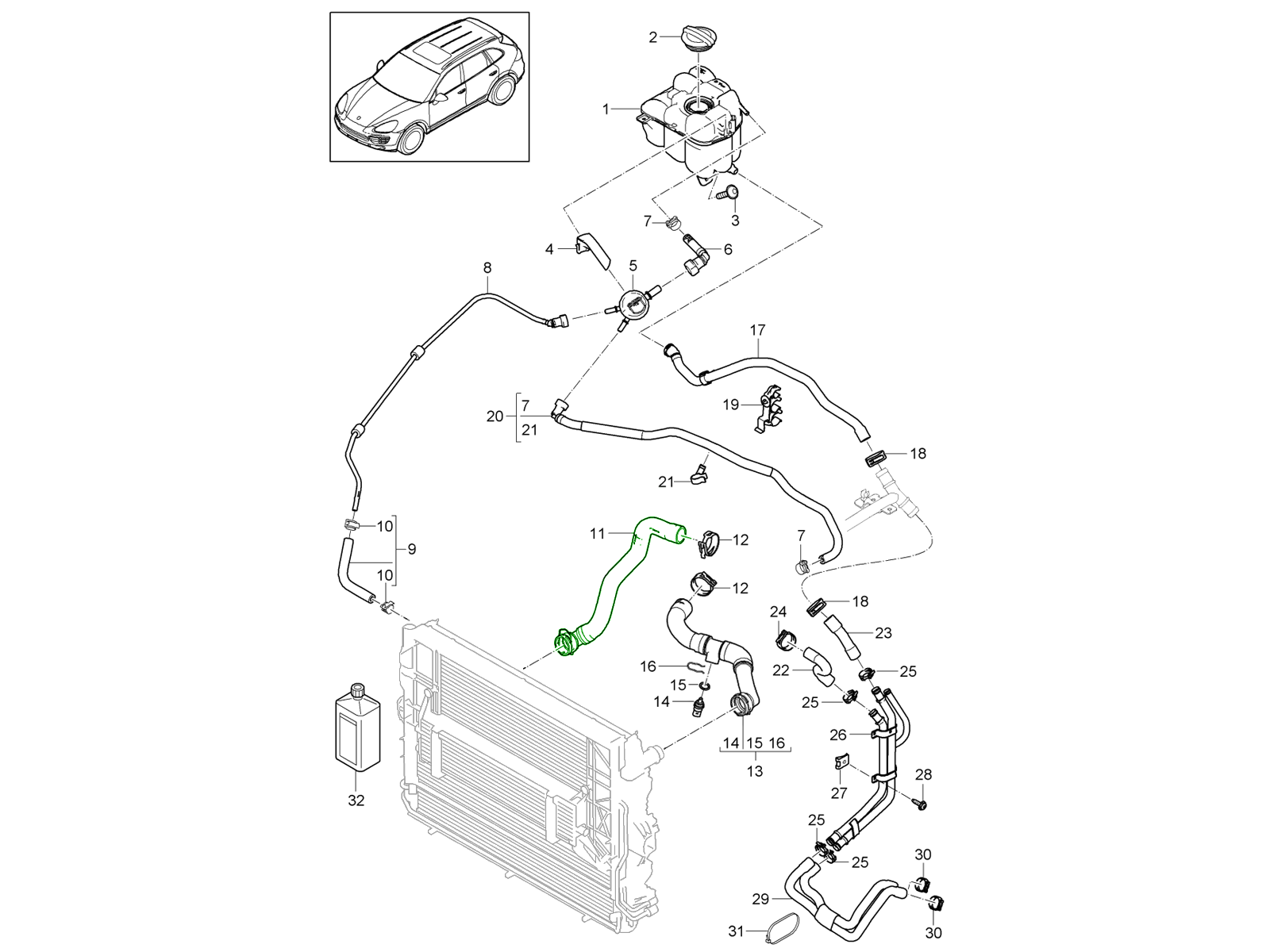 • Location: Connects radiator outlets to coolant pathways (lower/centre position in Cayenne cooling diagrams)