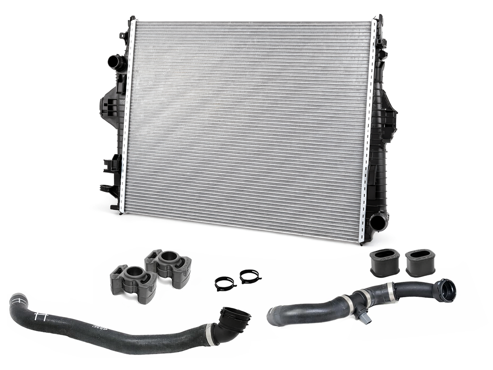 This complete radiator water, hose, and mounting kit is a service solution for the Porsche Cayenne 958 3.0L Diesel (2011–2018) cooling system. It combines a durable OE Match radiator core with genuine coolant hoses, genuine mounts, and genuine hose clamps — everything needed to reliably refresh the centre section of the cooling system in one comprehensive set.