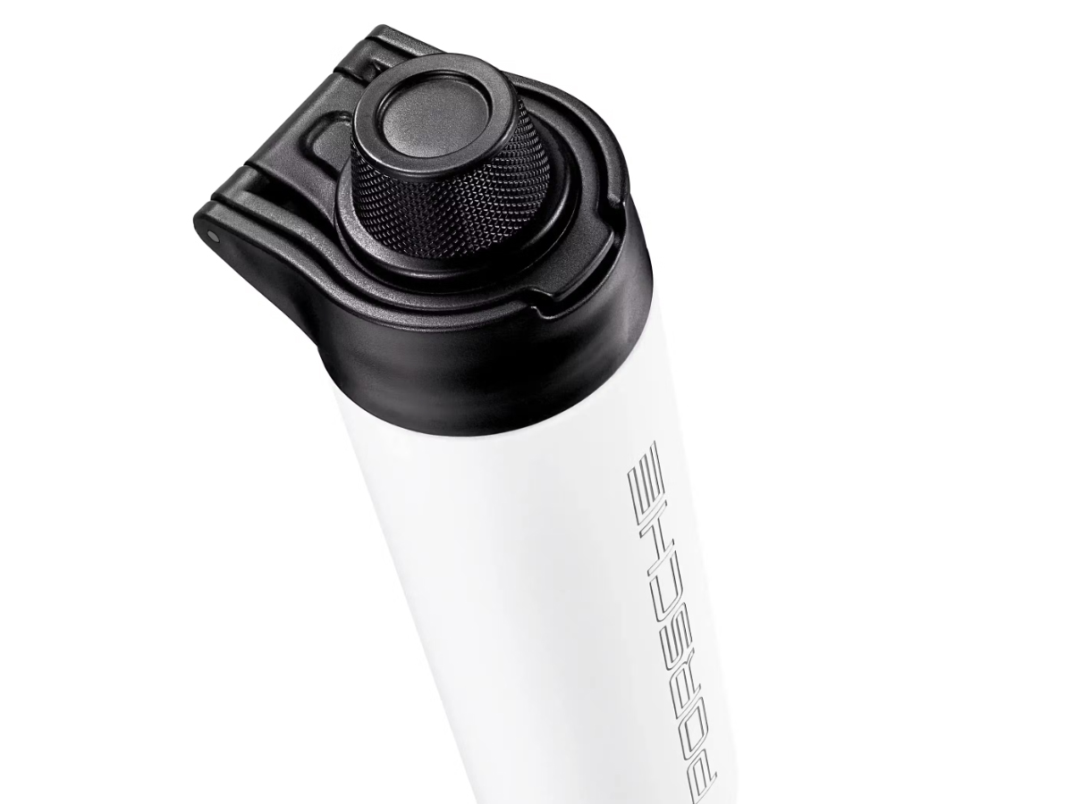 Aus doppelwandigem Edelstahl. Mit Porsche Wappen auf der Karosserie und einem vom Porsche Zentralverschluss inspirierten Stopper.