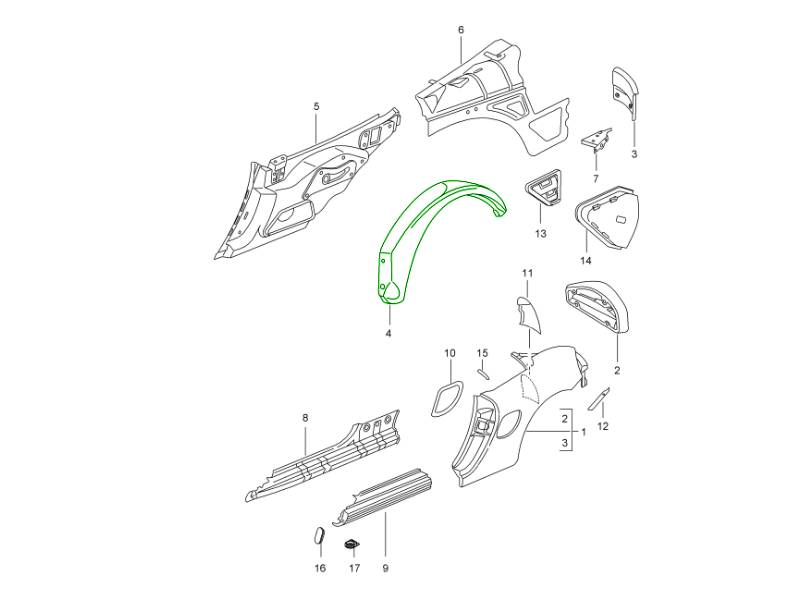 - Als passgenaues Karosserieteil trägt es zur strukturellen Integrität bei (das innere Radhaus ist oft mit der hinteren Seitenwandstruktur verbunden) und gewährleistet eine genaue Ausrichtung der Karosserieteile und Spaltmaße, wenn der Radlauf, die Seitenwand oder die hintere Stoßstange ersetzt oder repariert werden.