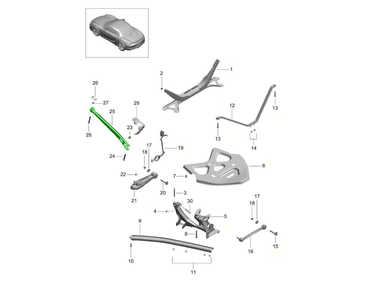 Dieser komplette Satz Hinterachsquerlenker enthält alle wichtigen Fahrwerkslenker, die für die vollständige Wiederherstellung der Hinterachsgeometrie des Porsche 981 Boxster/Cayman benötigt werden. Jeder Querlenker entspricht den originalen Porsche-Spezifikationen und ermöglicht präzise Federungsbewegungen, genaue Radgeometrie und ein scharfes Fahrverhalten.