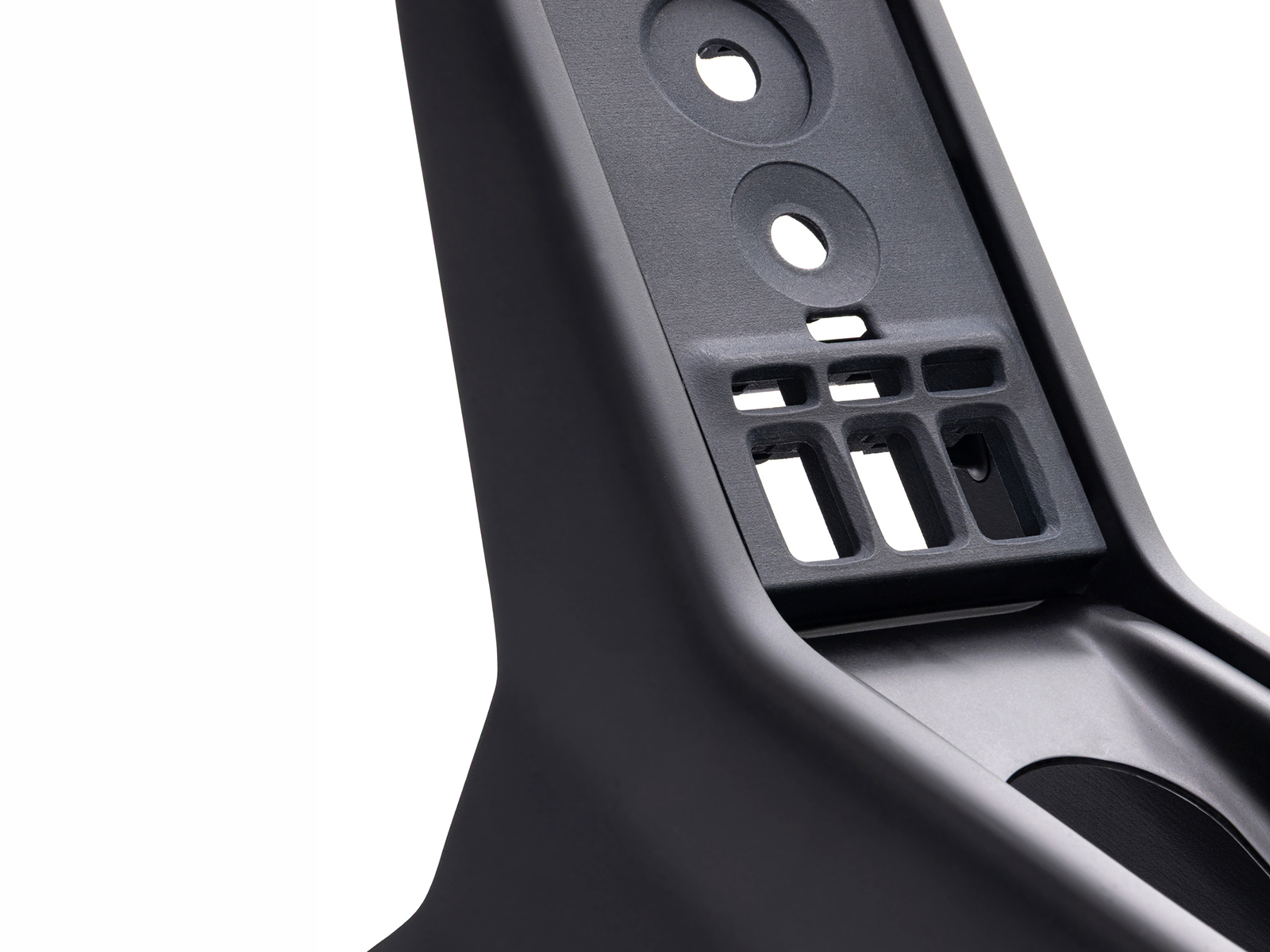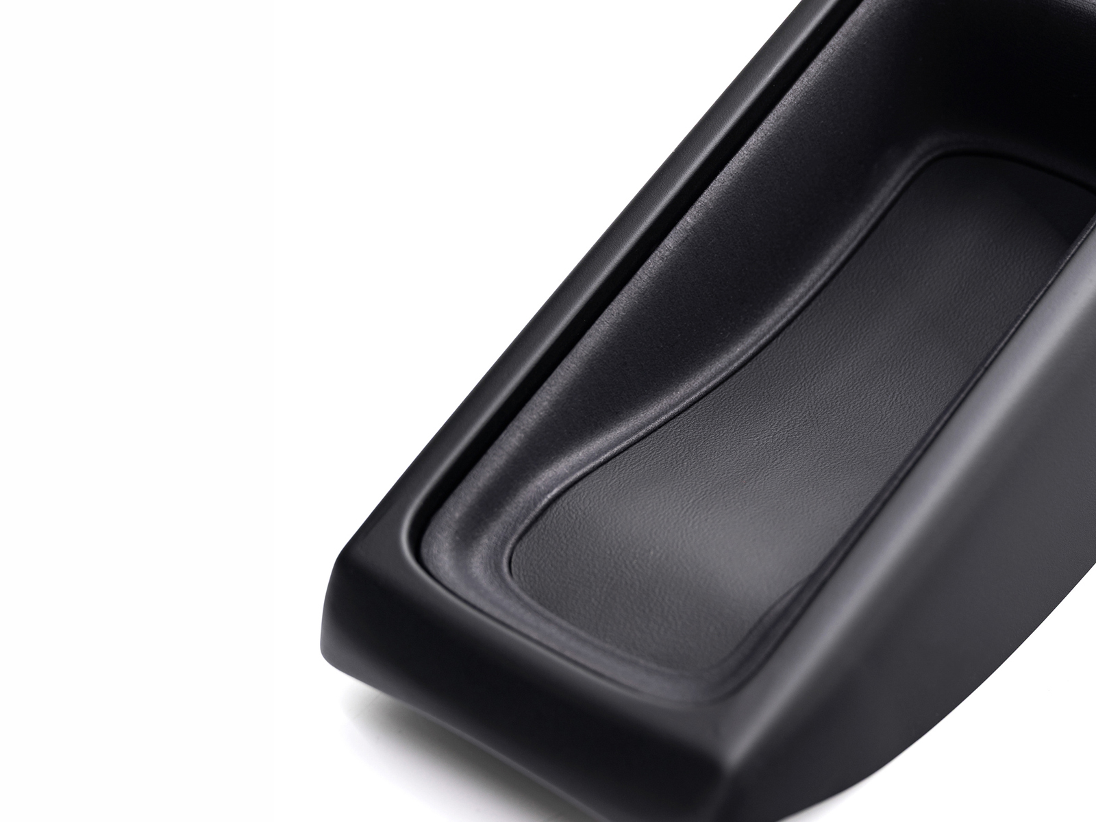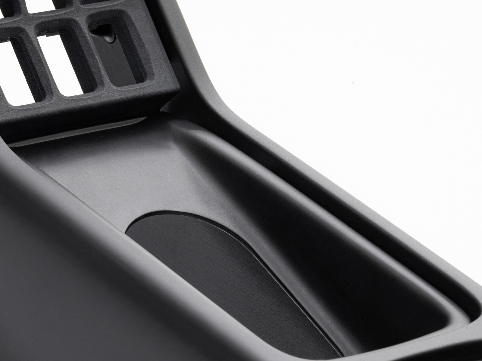 Esta consola central se diseñó para ser sencilla, práctica y reversible. Cada línea y cada hueco se moldearon cuidadosamente para facilitar el tapizado (en la versión RAW); incluso dejamos un pequeño espacio libre donde el material se pliega de forma natural.