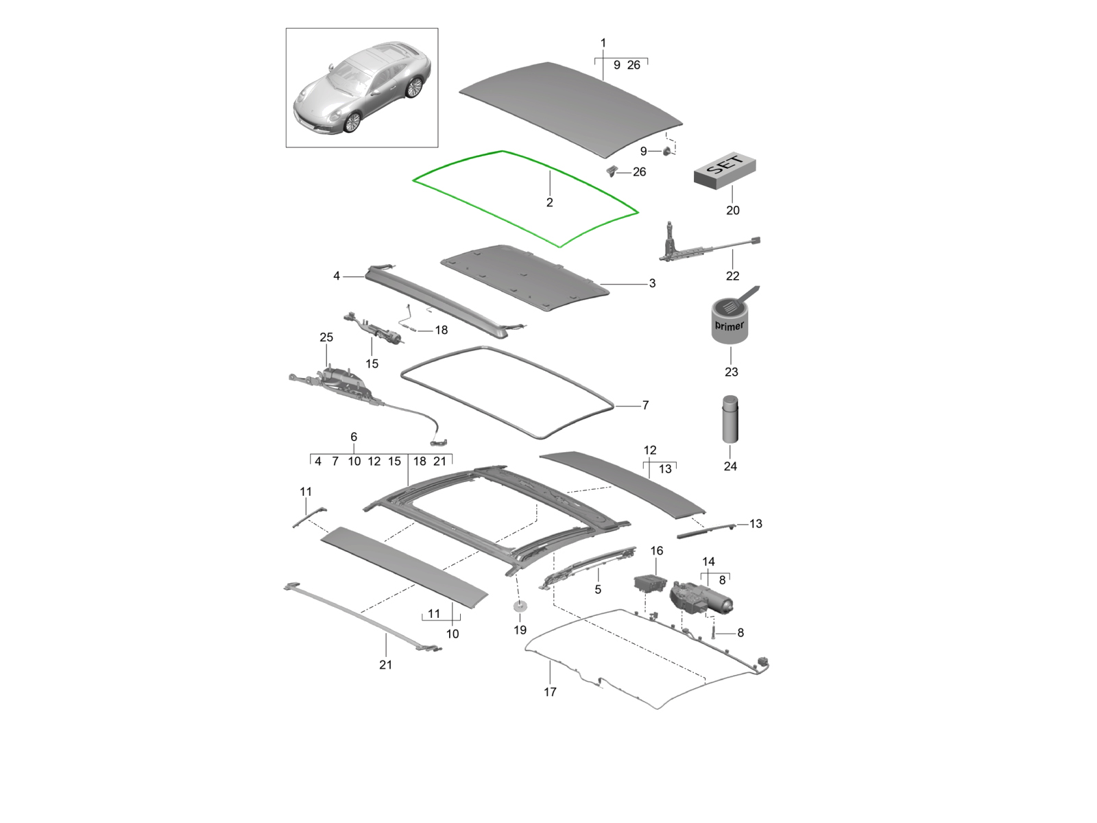 El kit de juntas para techo solar original de Porsche es un sistema de sellado contra la intemperie original de fábrica para el conjunto del techo corredizo utilizado en los modelos modernos del Porsche 911.