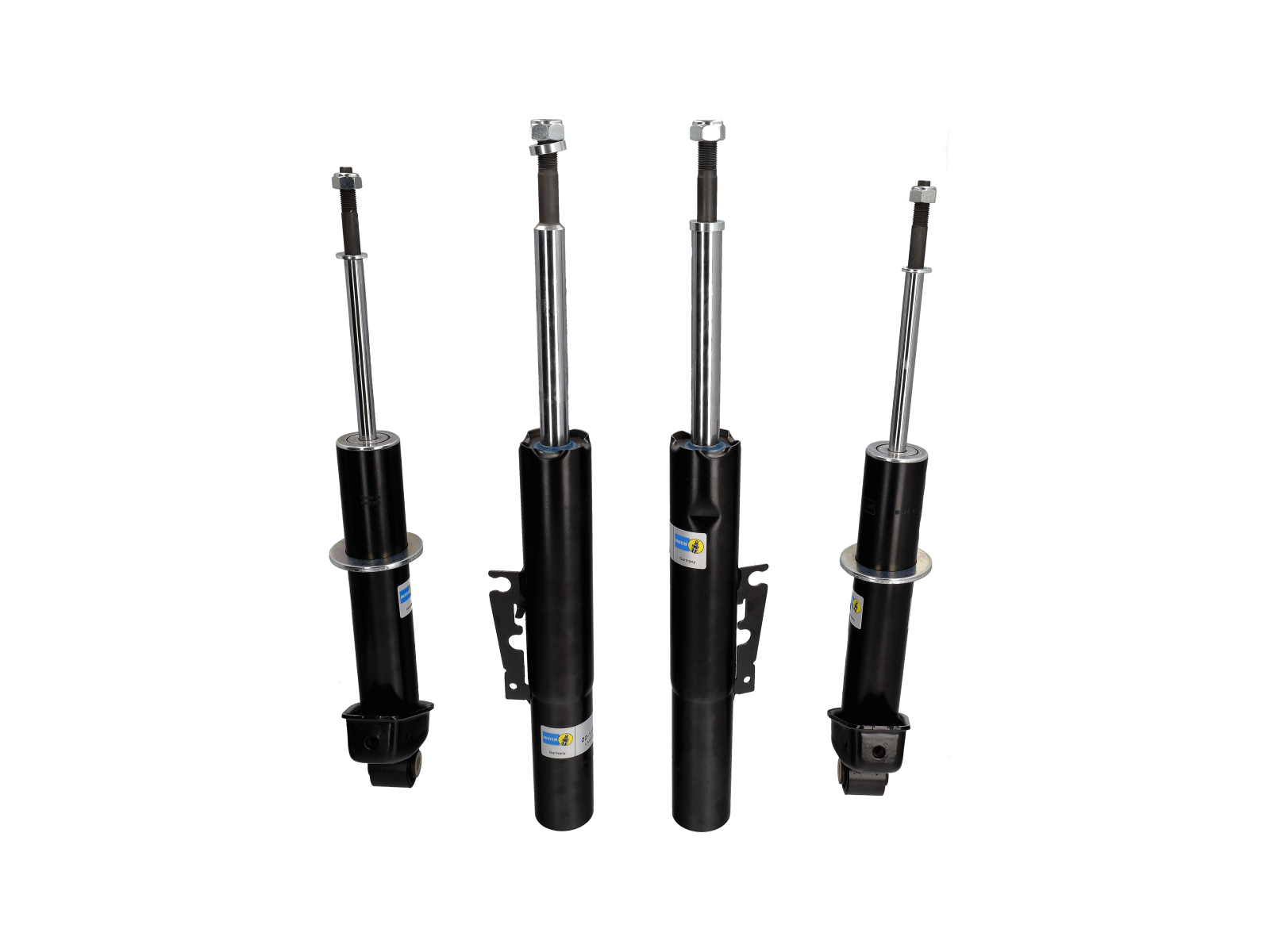 Amortiguadores de repuesto directo de alta calidad B4, fabricados y acabados según los altos estándares de Bilstein, a menudo muy superiores a los que venían con el coche originalmente. En realidad, pueden suponer una mejora del rendimiento si se sustituyen por amortiguadores simples, sin carga de gas y llenos de aceite. Reducen drásticamente la cavitación y la formación de espuma de aceite, lo que proporciona fuerzas de amortiguación más estables cuando se conduce "con brío". Algunos coches sorprendentes vienen con amortiguadores simples llenos de aceite.