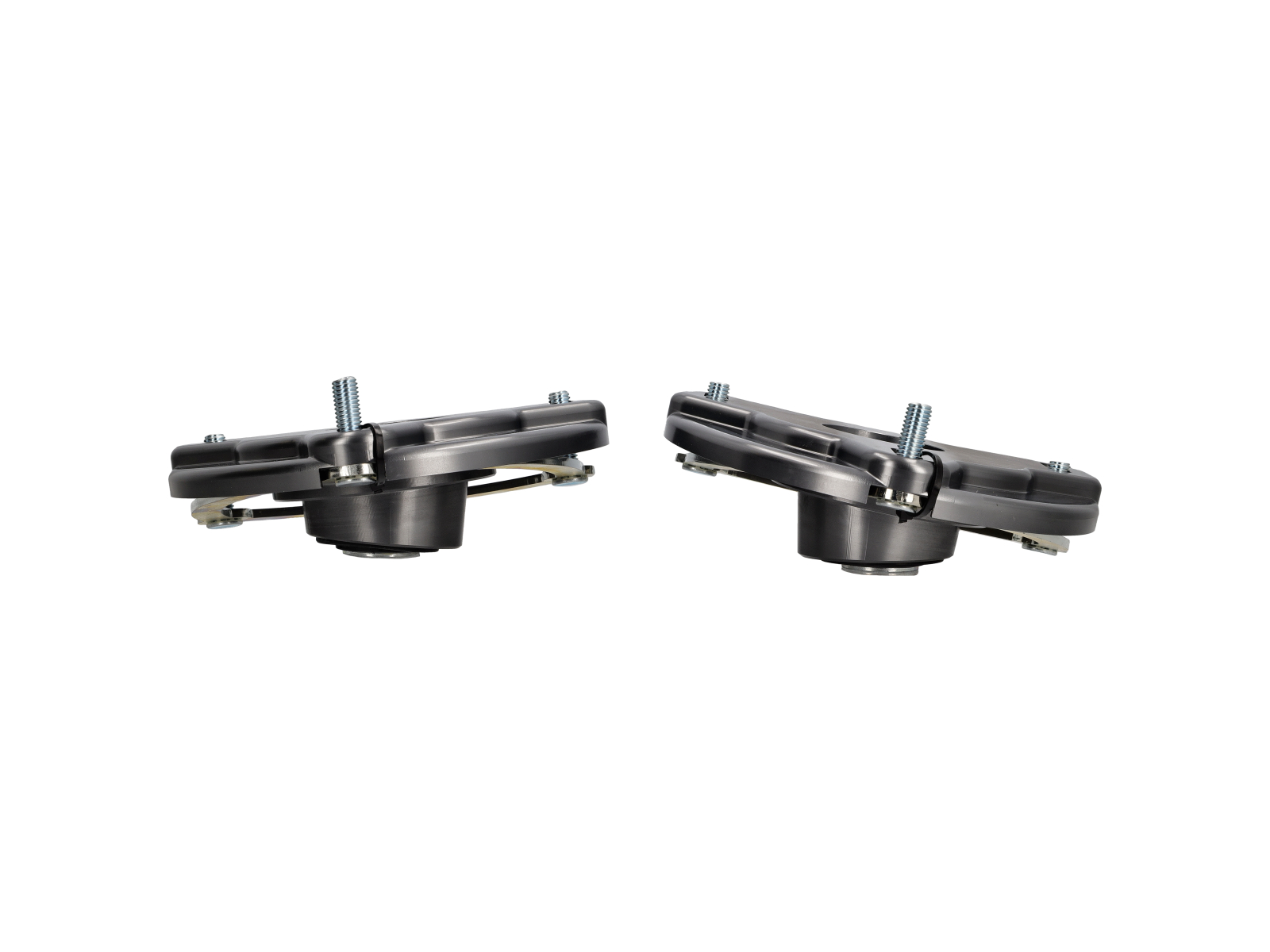 Reemplazo definitivo para el soporte de casquillo de goma de fábrica. Compatible con puntales OE y de posventa. Los orificios de montaje permiten más de 1 grado de inclinación negativa adicional. Construcción de aluminio anodizado negro 6061 mecanizado por CNC con herrajes de acero inoxidable. Reduce los cambios de inclinación de las ruedas delanteras durante las curvas cerradas para mantener un contacto óptimo de los neumáticos y mejorar la tracción.