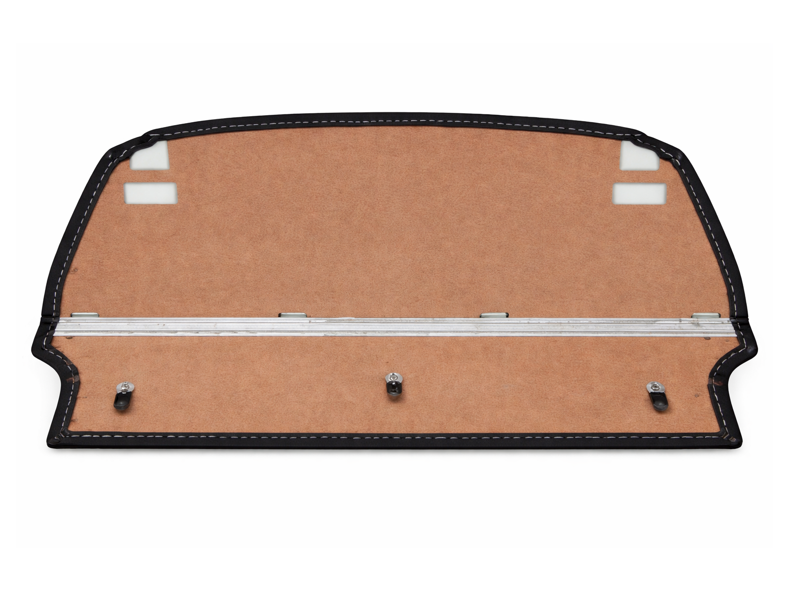 Panneau arrière complet prêt à monter (tablette arrière / revêtement de cloison arrière) pour les modèles Porsche 911 Coupé 1965–1971 avec barre profilée métallique comme d'origine. Disponible en cuir Porsche Napp noir ou en vinyle classique Porsche.