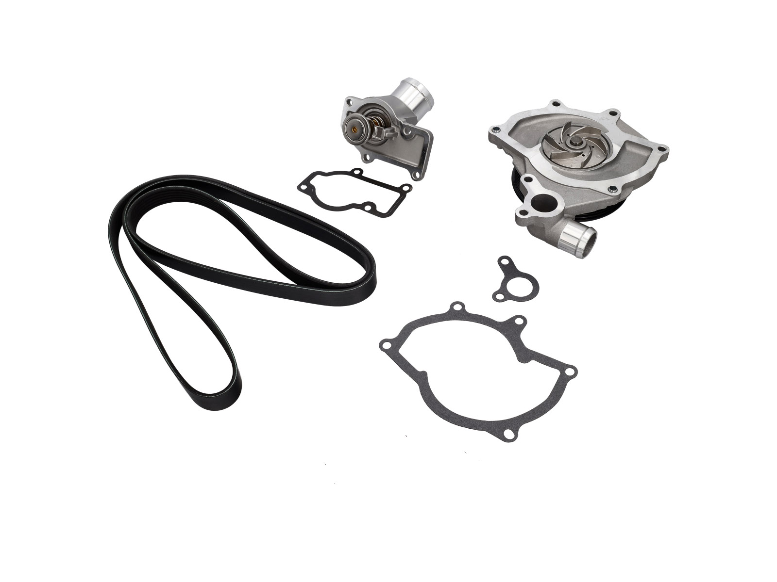 Pompe à eau de remplacement avec joint, courroie d'entraînement et thermostat.