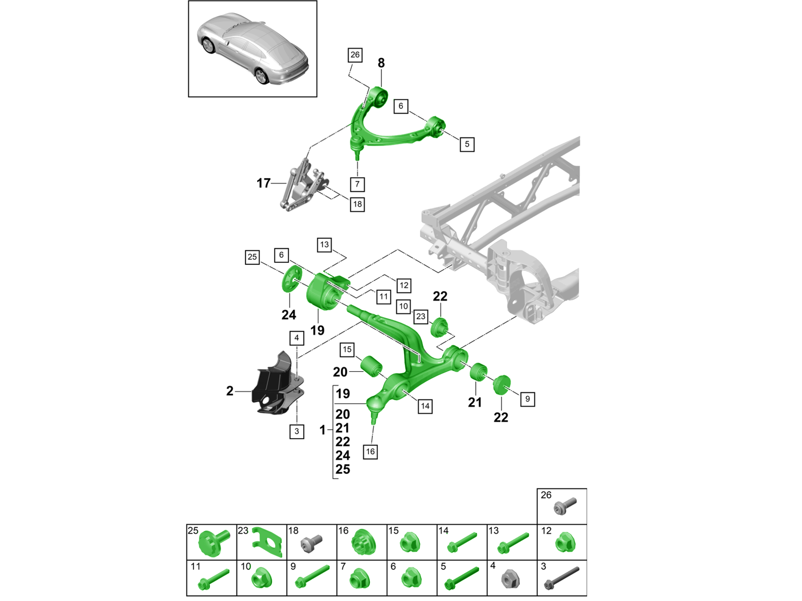 Ce kit de triangles inférieurs de suspension, conforme aux spécifications d'origine, est une solution de suspension avant de haute qualité pour la Porsche Panamera 971 (Groupe de charge de base 1). Il comprend une paire complète de triangles inférieurs (gauche et droit) conçus pour respecter, voire dépasser, les spécifications d'origine Porsche, ainsi que la visserie Porsche d'origine nécessaire pour une installation sûre et correcte.