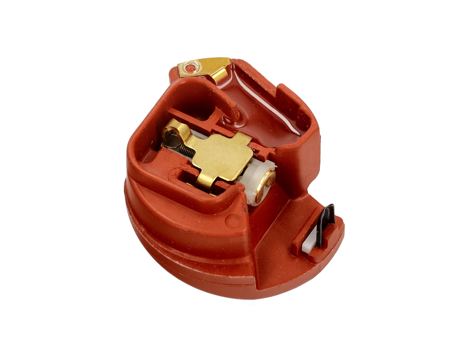 Il rotore è costruito in modo tale che la linguetta centrale sia collegata elettricamente al suo bordo esterno, in modo che la tensione che arriva al perno centrale passi attraverso il punto di carbonio fino al bordo esterno del rotore. Quando l'albero a camme ruota, il rotore gira e il suo bordo esterno passa attraverso ciascuno dei terminali interni delle candele per accendere ciascuna candela.
