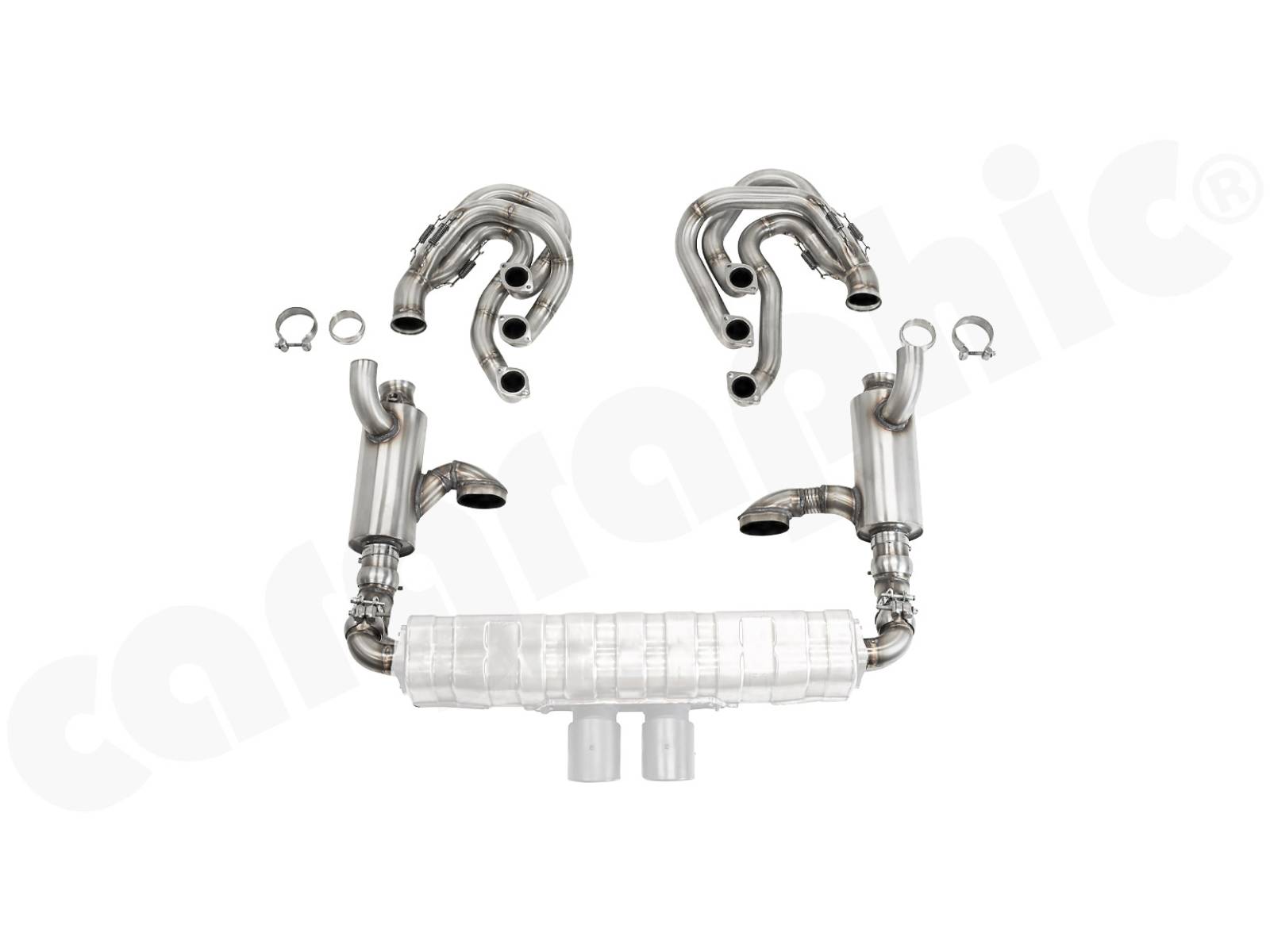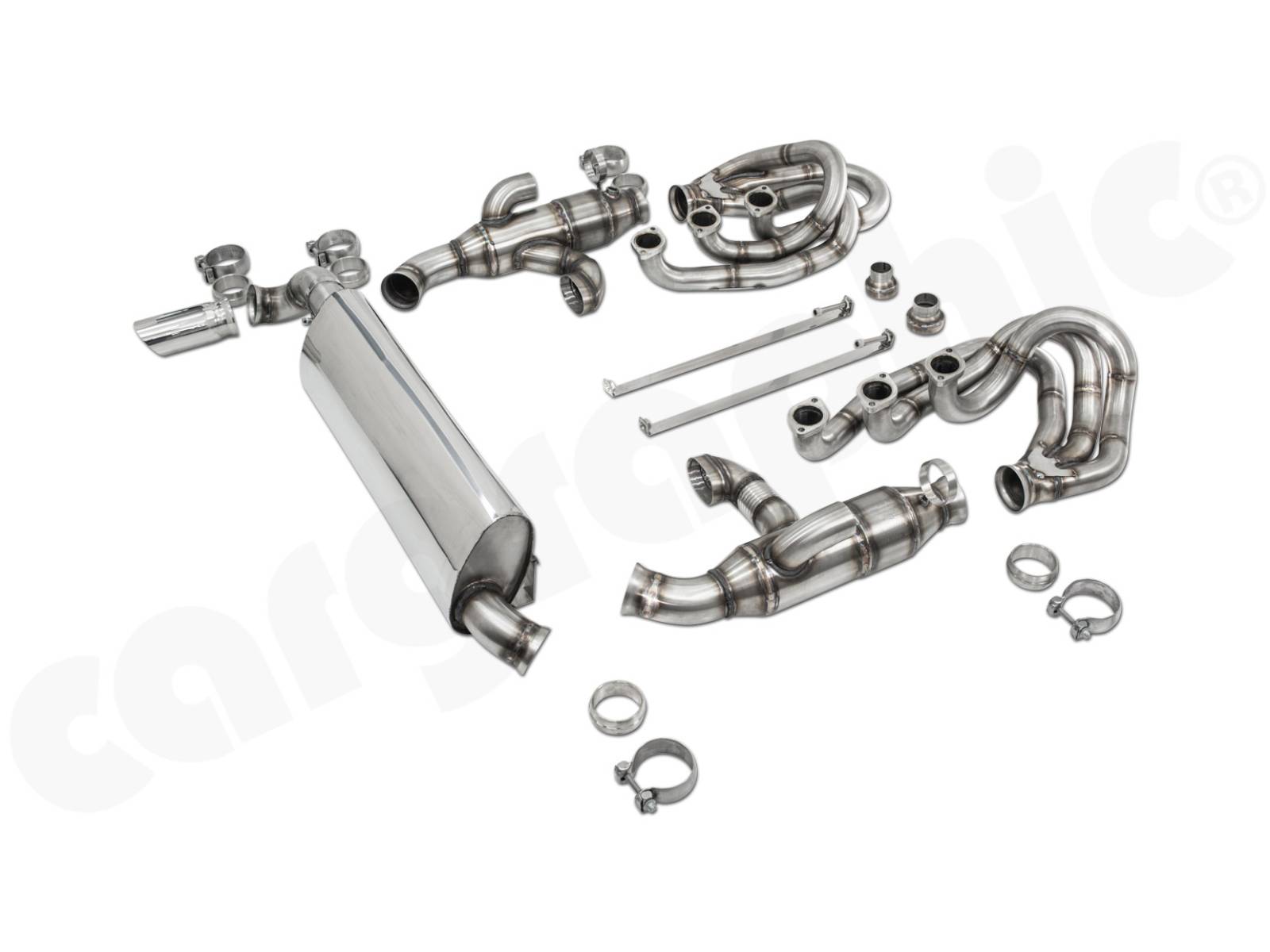 Sistema di scarico sportivo CARGRAPHIC GT Backdate con set collettore ID45 GT, con/senza catalizzatori 2x200cpsi, senza riscaldamento con valvole di scarico - da utilizzare con silenziatore posteriore OEM GT3.
