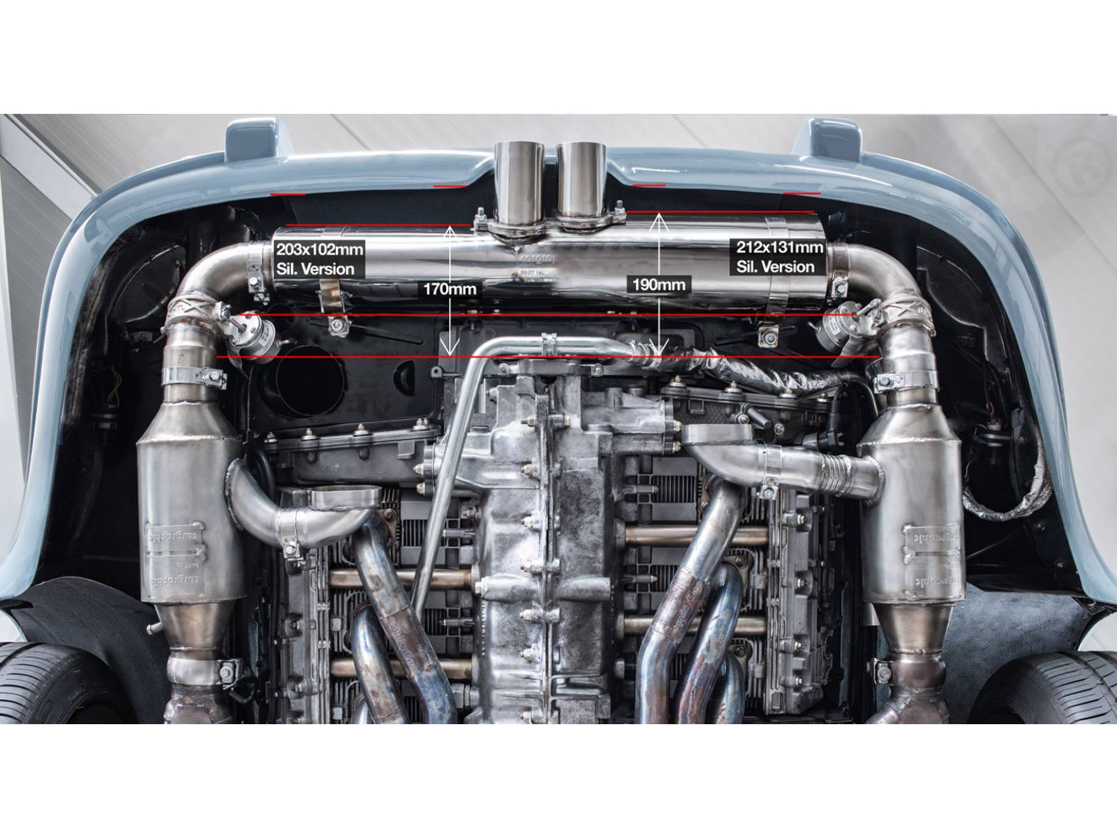 Sistema di scarico sportivo CARGRAPHIC GT Backdate con set collettore ID45 GT, con/senza catalizzatori 2x200cpsi, con riscaldamento da utilizzare con silenziatore posteriore OEM GT3.