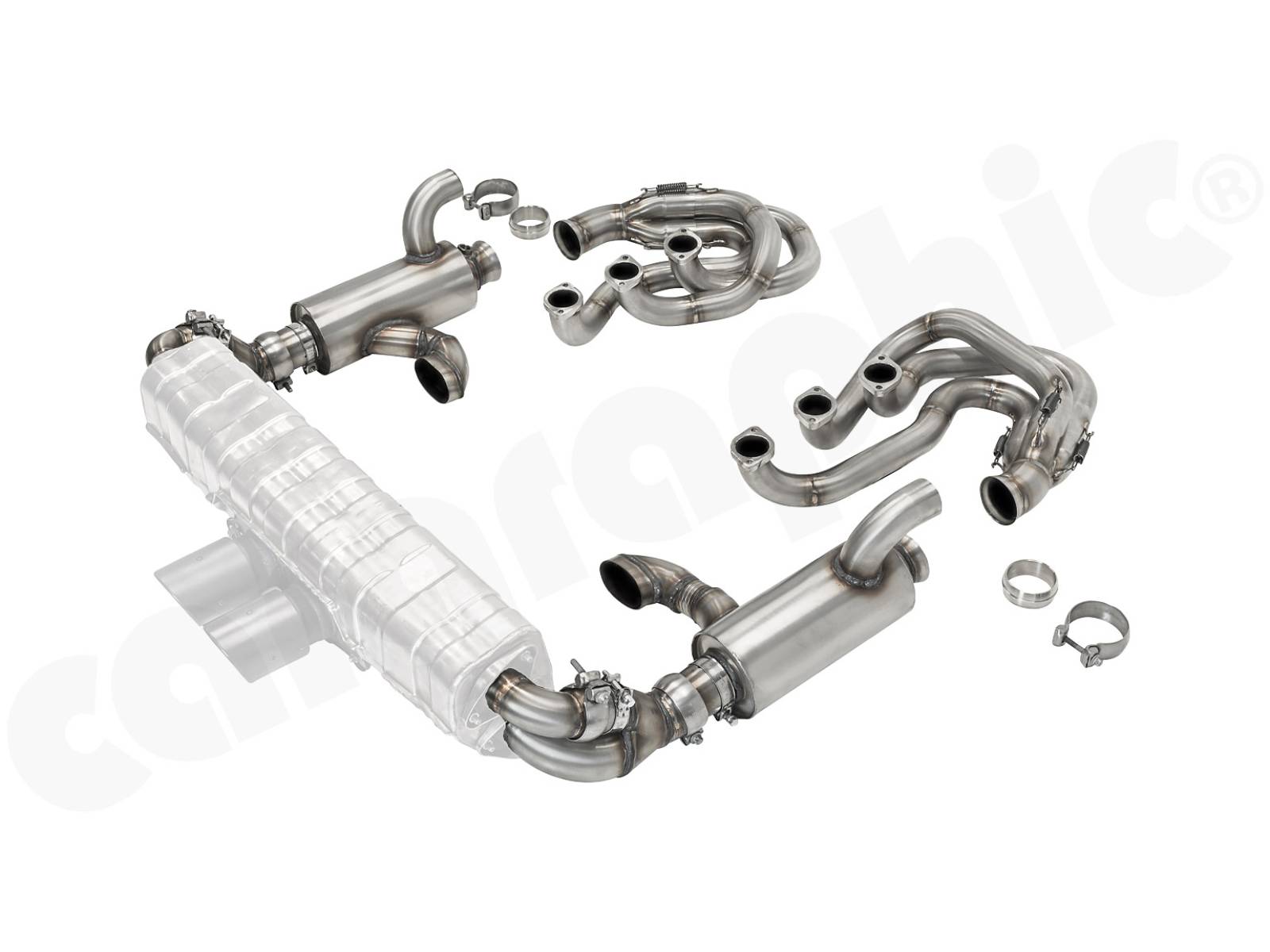 Sistema di scarico sportivo CARGRAPHIC GT Backdate con set collettore ID45 GT, con/senza catalizzatori 2x200cpsi, senza riscaldamento da utilizzare con silenziatore posteriore OEM GT3.
