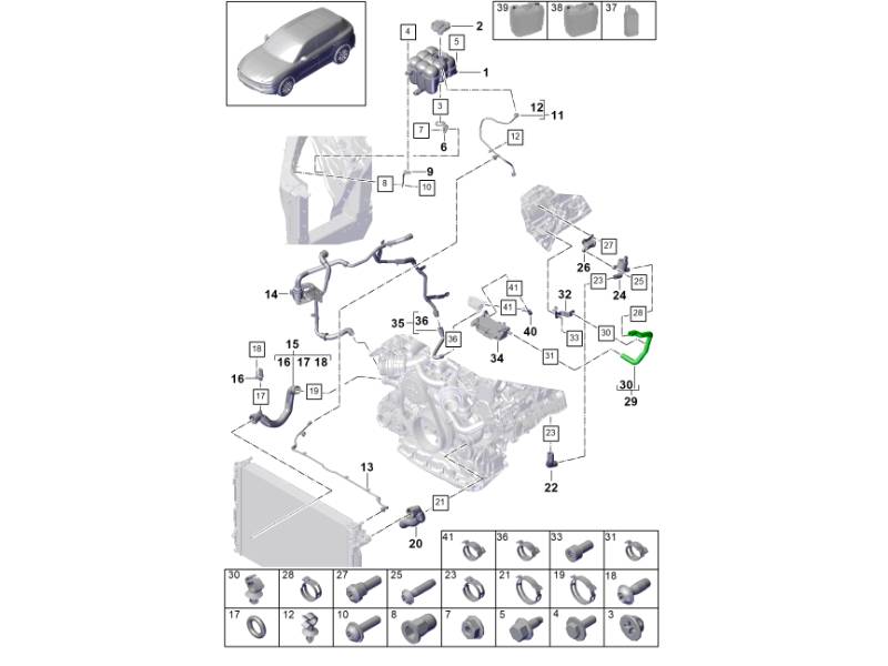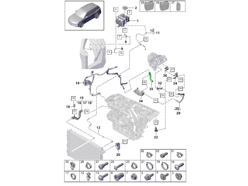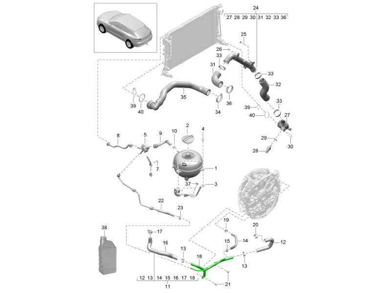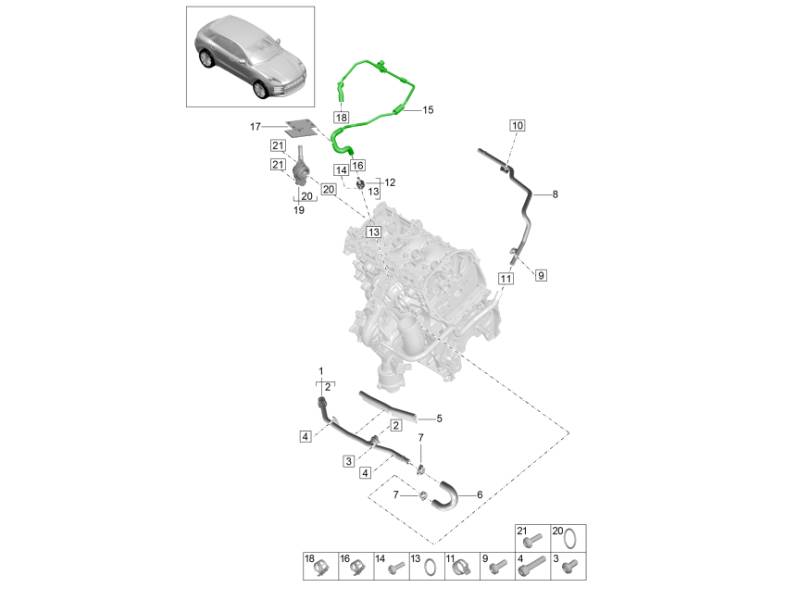 De ontluchtingsslang voor de koelvloeistof (bovenste middenstuk) is een origineel Porsche-onderdeel van het koelsysteem, ontworpen om ingesloten lucht en dampen uit het bovenste gedeelte van het koelvloeistofcircuit van de motor af te voeren. Deze slang, centraal geplaatst in het bovenste koelsysteem, speelt een cruciale rol in het handhaven van een goede koelvloeistofcirculatie en een evenwichtige systeemdruk.