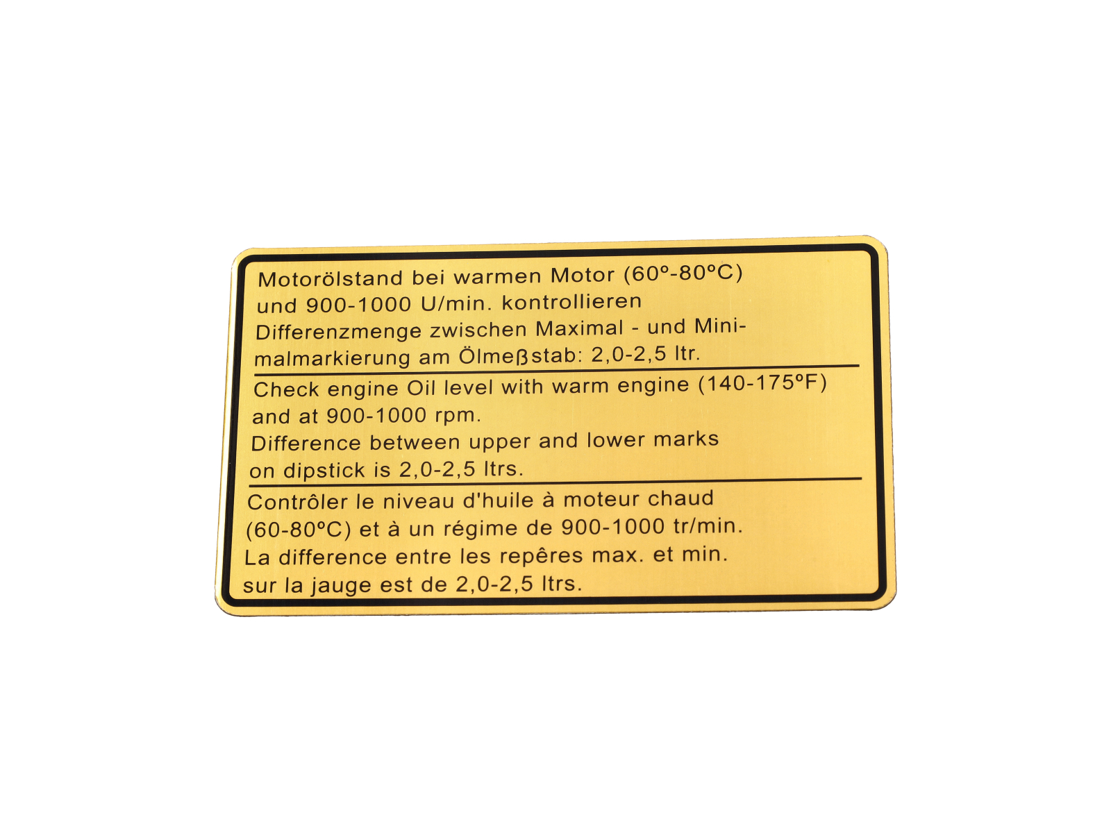 Stickers die het motoroliepeil aangeven, bieden essentiële referentie-informatie voor het onderhouden van het smeersysteem van uw Porsche.