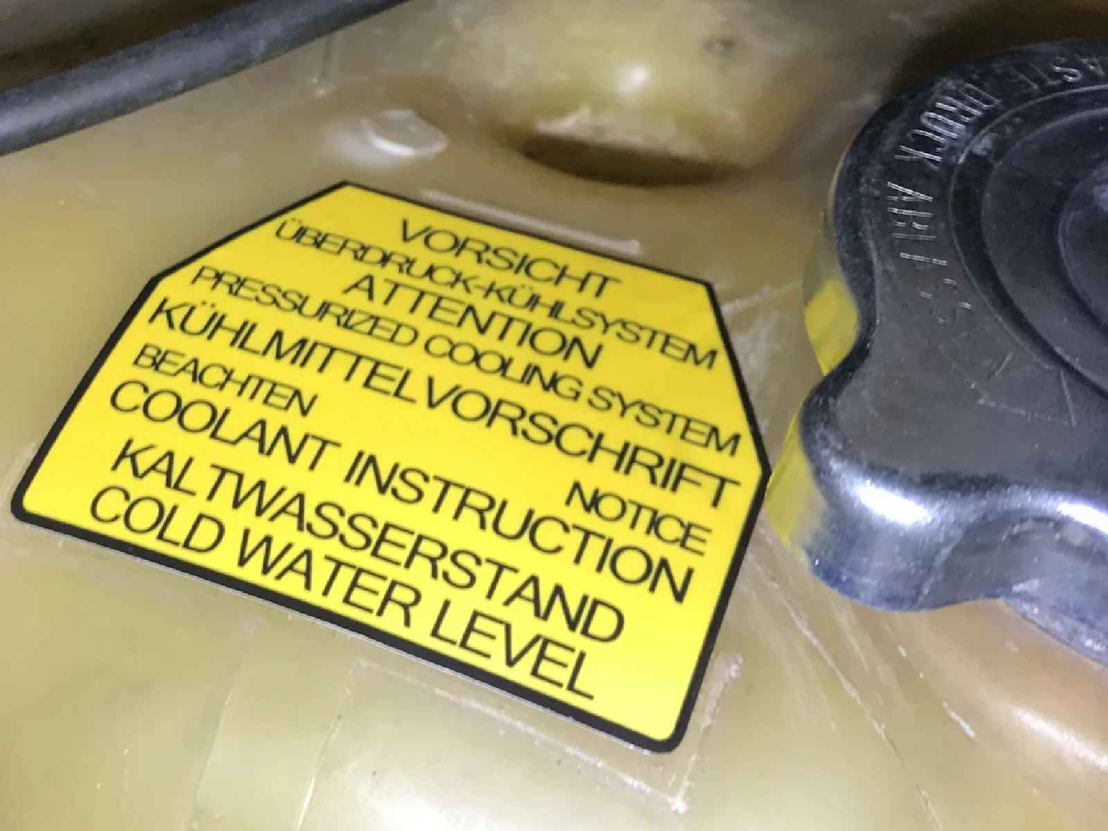 Hoogwaardige reproductiesticker voor het koelvloeistofexpansievat, ontworpen om overeen te komen met de originele fabriekssticker die op Porsche 928-modellen werd gebruikt.