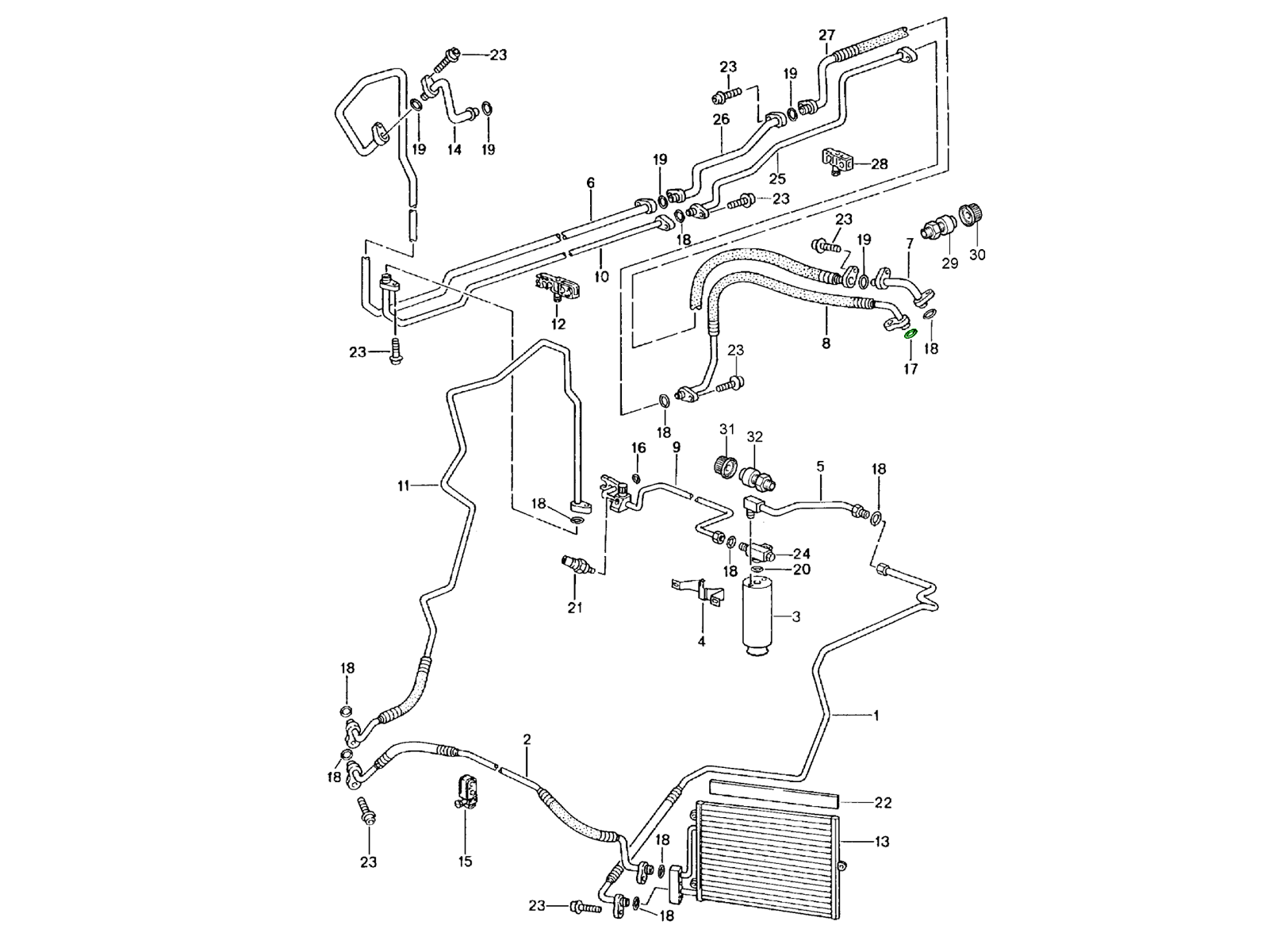 • Locatie: Tussen de airco-condensor (radiator) en de koelmiddelleidingen/slangen