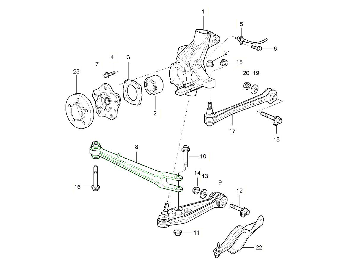De achterste draagarmen zijn essentiële onderdelen van de ophanging die de nauwkeurige wieluitlijning, de balans en de stabiliteit van uw Porsche in bochten en bij het remmen waarborgen. Deze armen verbinden het chassis met de achterwielnaven, waardoor gecontroleerde veerbewegingen mogelijk zijn en de wielen correct ten opzichte van de weg worden gepositioneerd. Hoogwaardige draagarmen zorgen voor consistent contact met de banden, een optimale geometrie en de responsieve, wendbare prestaties die kenmerkend zijn voor het rijgedrag van Porsche.