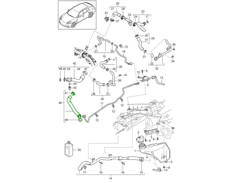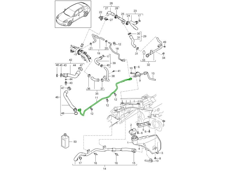 De koelvloeistofslang is een originele Porsche OEM-koelvloeistofslang, ontworpen om koelvloeistof door het koelsysteem van bepaalde Porsche Panamera (970)-modellen te transporteren. Deze flexibele slang zorgt voor een goede circulatie van de koelvloeistof tussen de belangrijkste koelcomponenten, waardoor de motortemperatuur stabiel blijft en de verwarming betrouwbaar blijft werken. De slang is vervaardigd volgens Porsche-specificaties en biedt een nauwkeurige pasvorm, hoge weerstand tegen hitte en druk, en een lange levensduur.