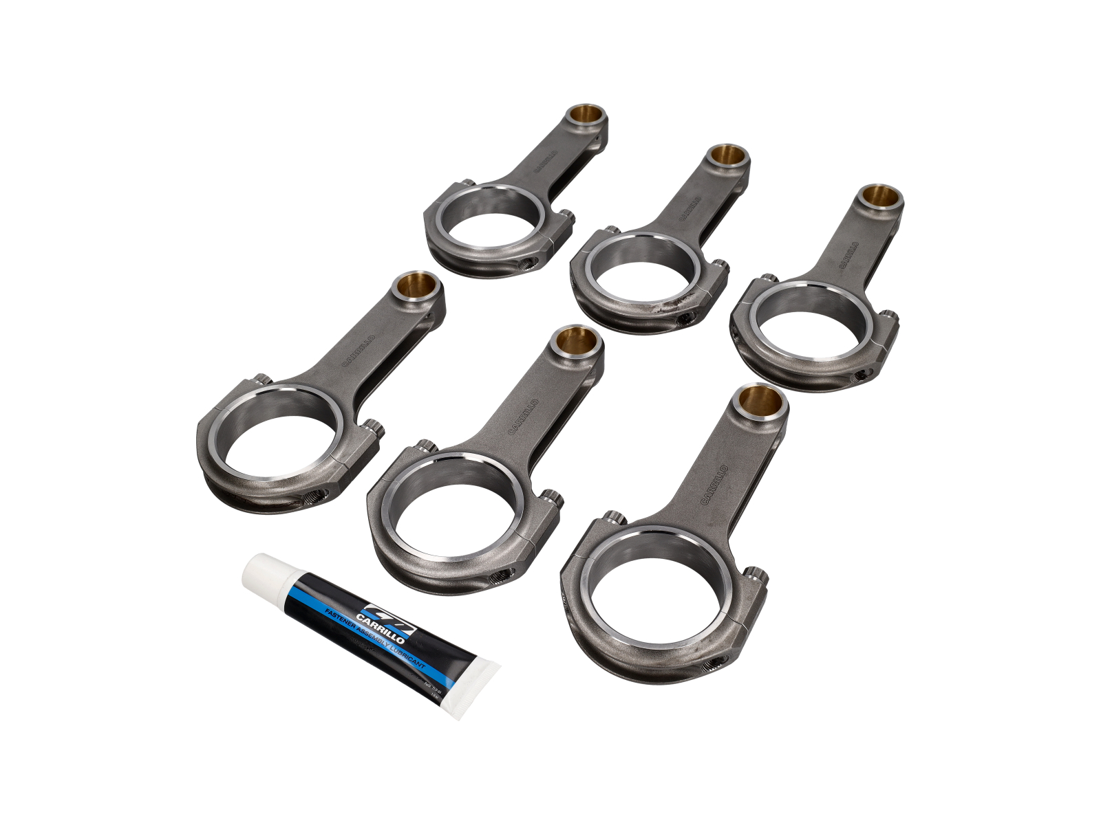 CP-Carrillo connecting rods are fully machined from a proprietary 4330m alloy forging for strength and durability. Rods are available with 2 types of bolts: The standard WMC-H6 bolt with a UTS of 220ksi and our upgraded CARR-S6 bolt with a UTS of 285ksi. The CARR upgraded bolt is a good choice if planning on revving the engine higher than 8500rpm.