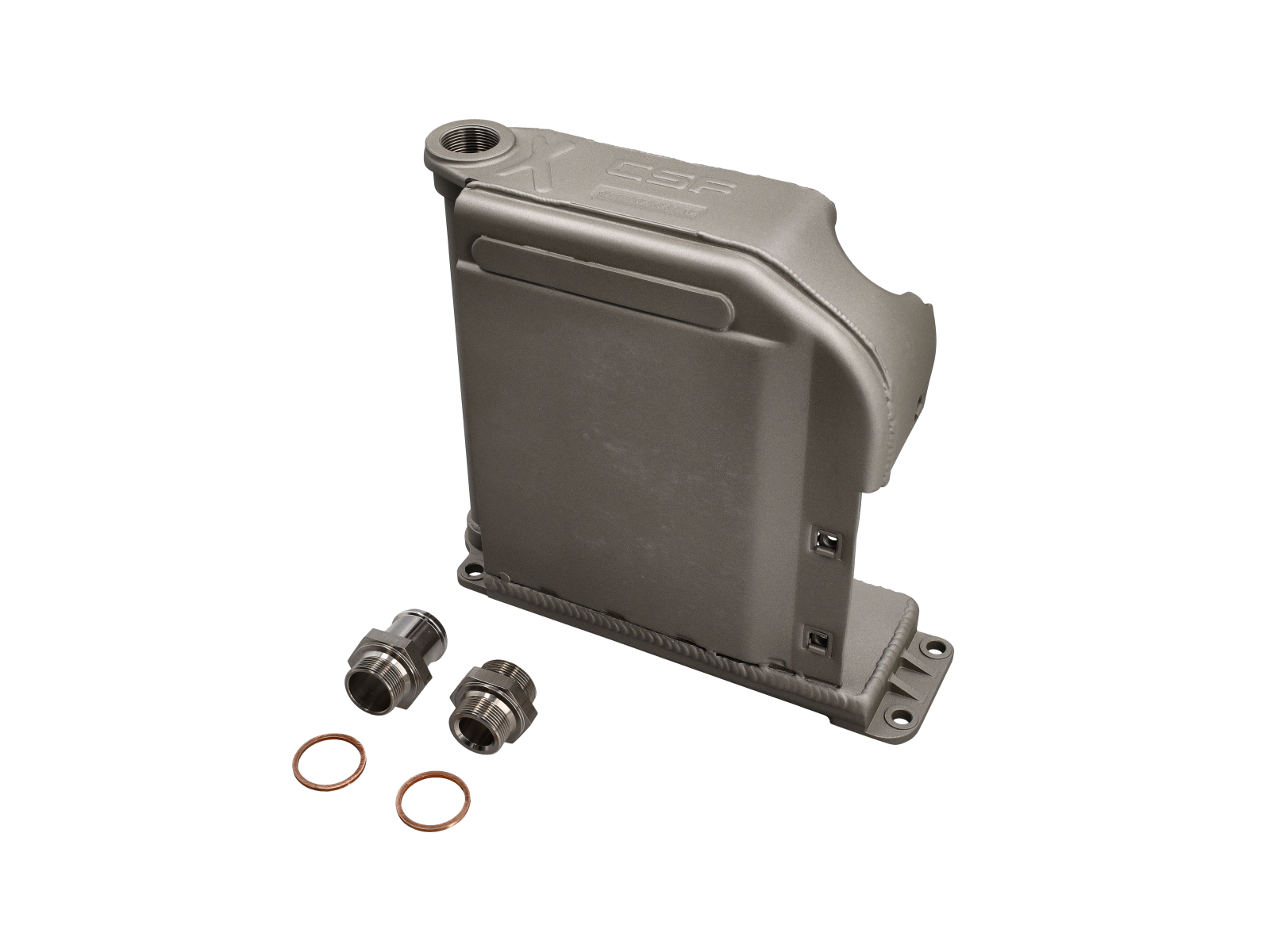 Because the base plate of the cooler is also a common problem area, CSF sought to improve this area as much as possible. Instead of the original cast design, the CSF cooler uses a CNC machined billet aluminum plate. This offers a perfectly flat mounting surface which is both stronger and more resistant to warping over time. You’ll also notice a special helix design which adds strength while keeping weight at a minimum.