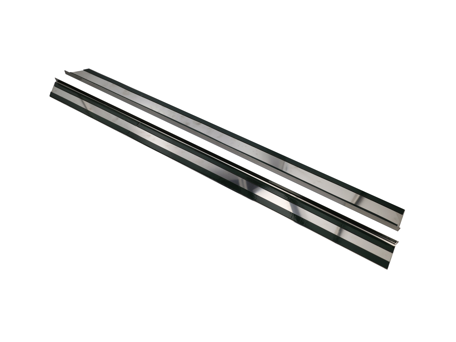 This door sill cover set includes two polished stainless-steel plates, designed to replace the original factory sill trims on the left and right sides of the door threshold.