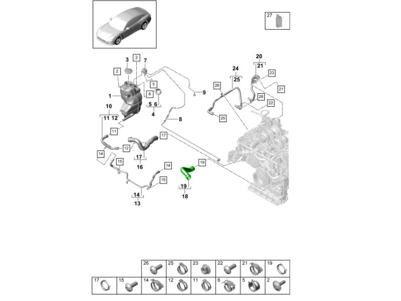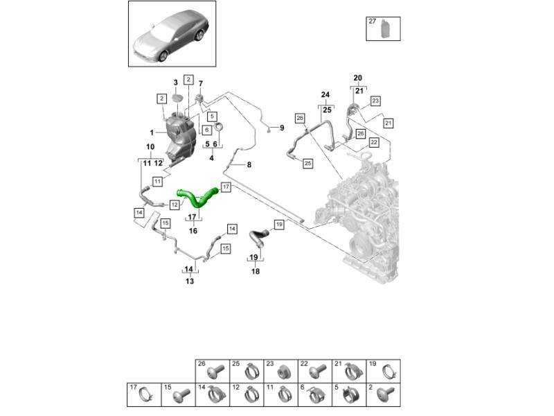 The Coolant Hose for Reservoir, Lower is a genuine Porsche OEM coolant hose designed to connect the lower section of the coolant expansion tank to the engine cooling system. This hose plays an important role in maintaining proper coolant circulation and pressure balance by routing overflow and return coolant through the closed-loop cooling circuit. Manufactured to Porsche specifications, it provides precise fitment, excellent resistance to heat and coolant exposure, and long-term durability for Porsche Panamera (971 / 976) models.