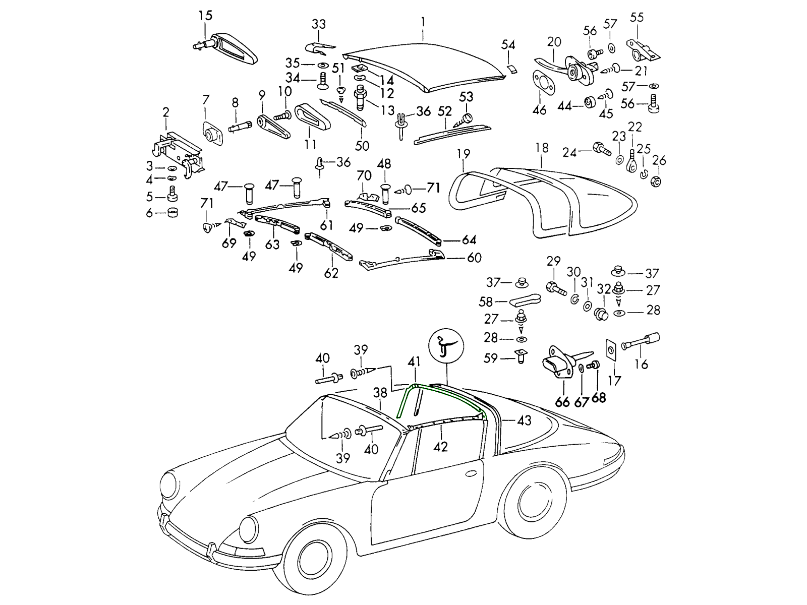 - 经典 911 的 Targa 车顶或敞篷车顶机构使用安装件/附件来正确地锁紧、旋转或张紧车顶面板。