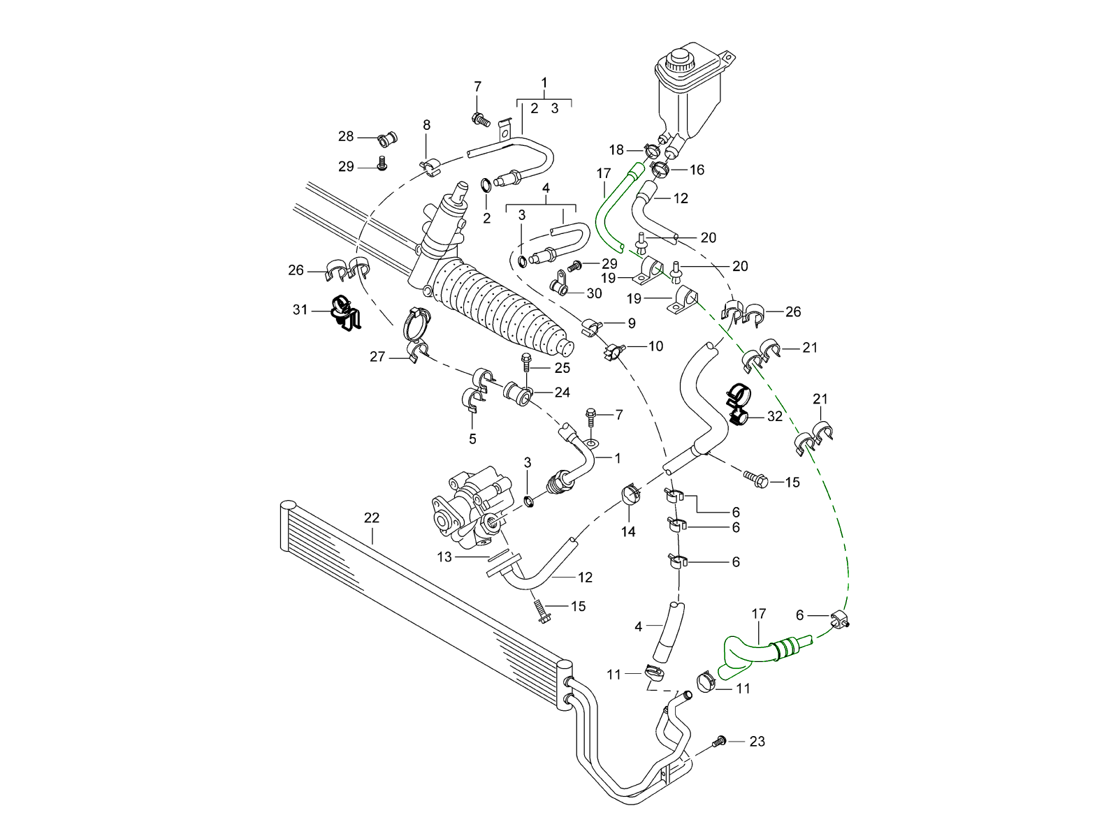 动力转向管和软管在泵、齿条和储液器之间传输液压油,而散热器(或冷却器)则调节油温以保持一致的性能。
