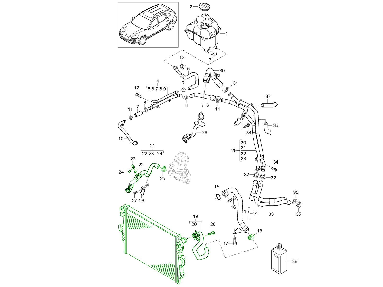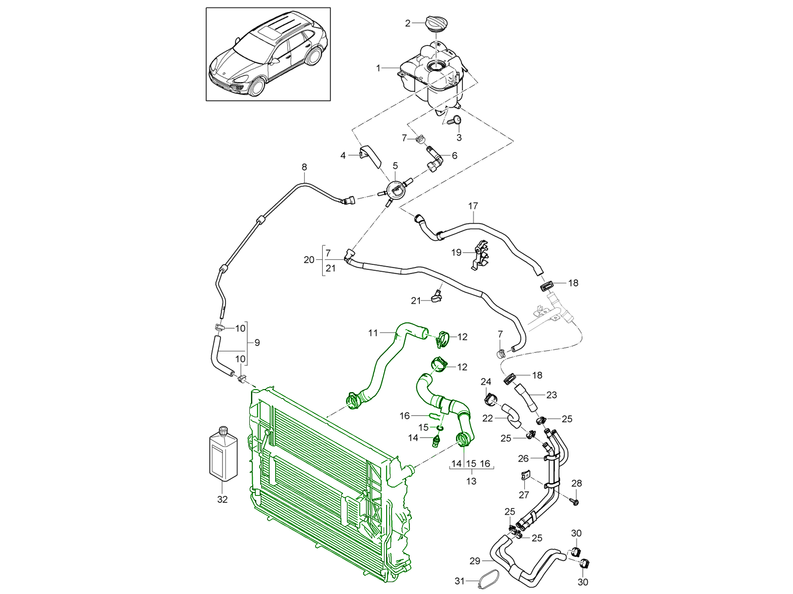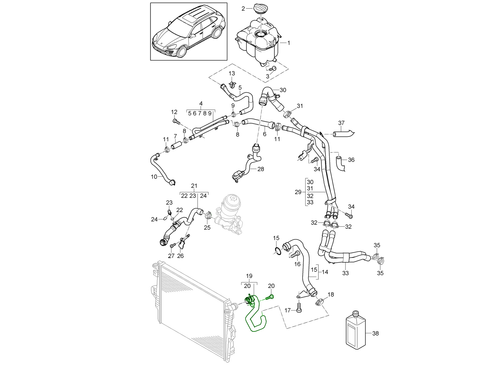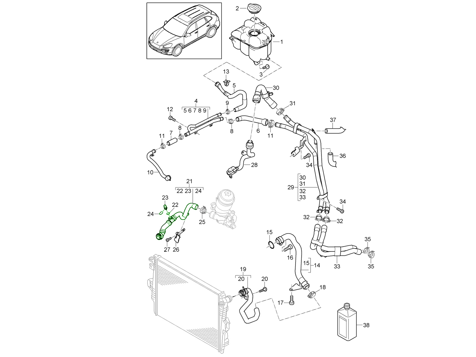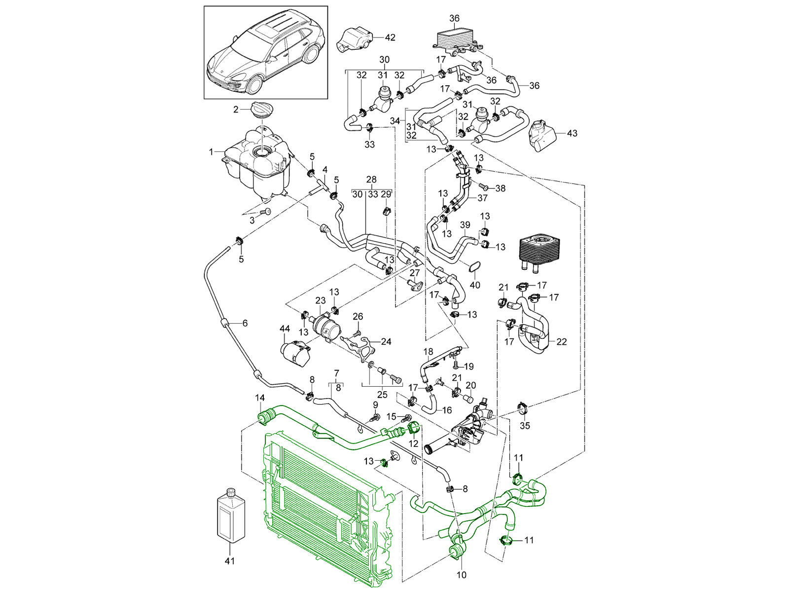 • Location: Connects radiator outlets to coolant pathways (lower/centre position in Cayenne cooling diagrams)