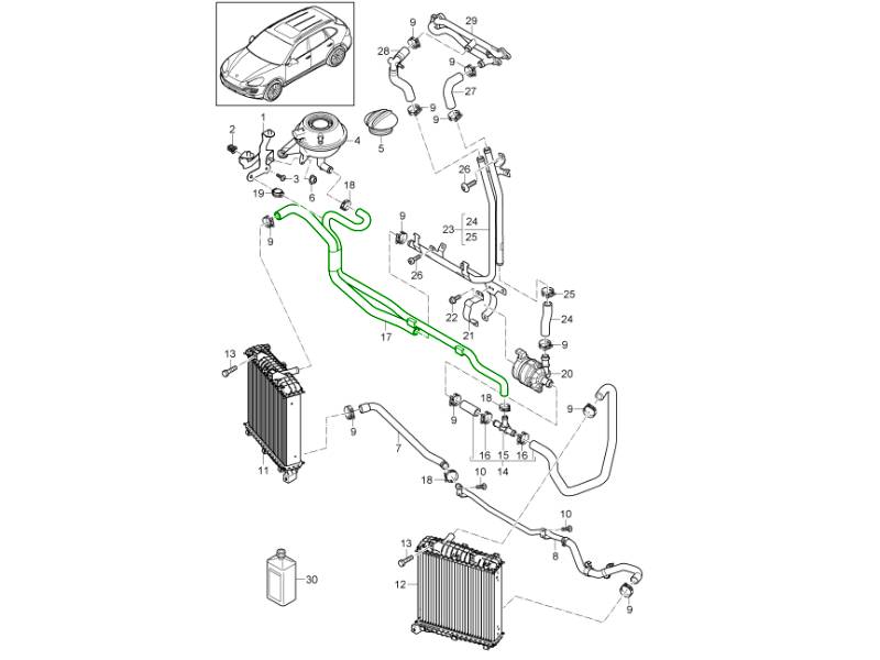 Heat management is crucial in a hybrid SUV like the Cayenne. Over time, radiators can lose efficiency as fins corrode or clog, hoses can harden and crack, and mounts can wear, leading to: