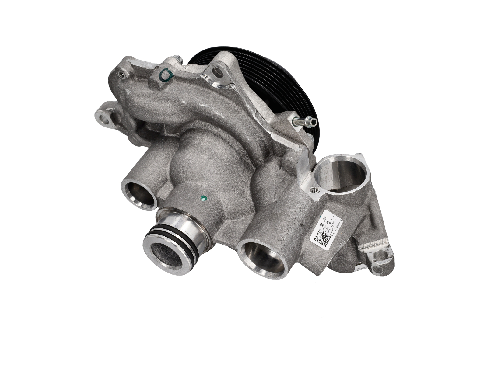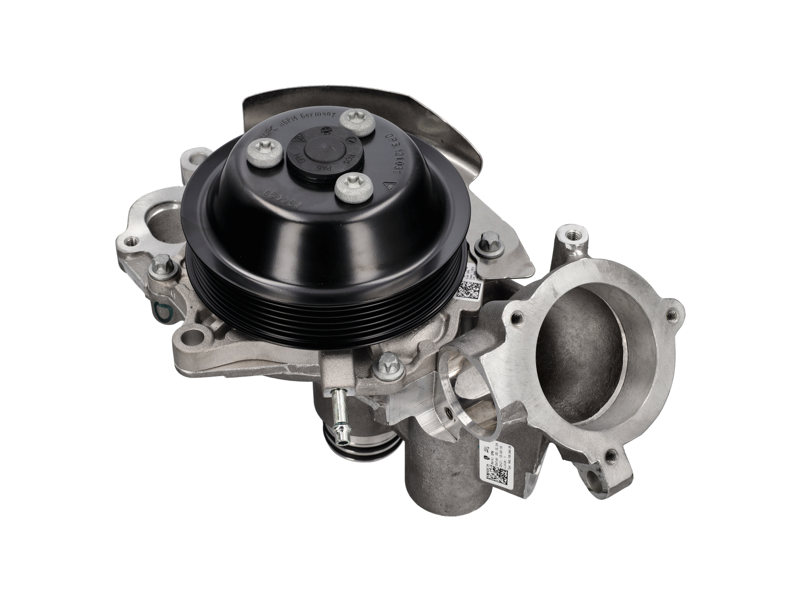The coolant pump with pulley bearing housing is a key component of the engine cooling system, designed to circulate coolant throughout the engine and maintain optimal operating temperature. This assembly includes the water pump along with an integrated pulley and bearing housing, ensuring smooth mechanical operation and reliable coolant flow.