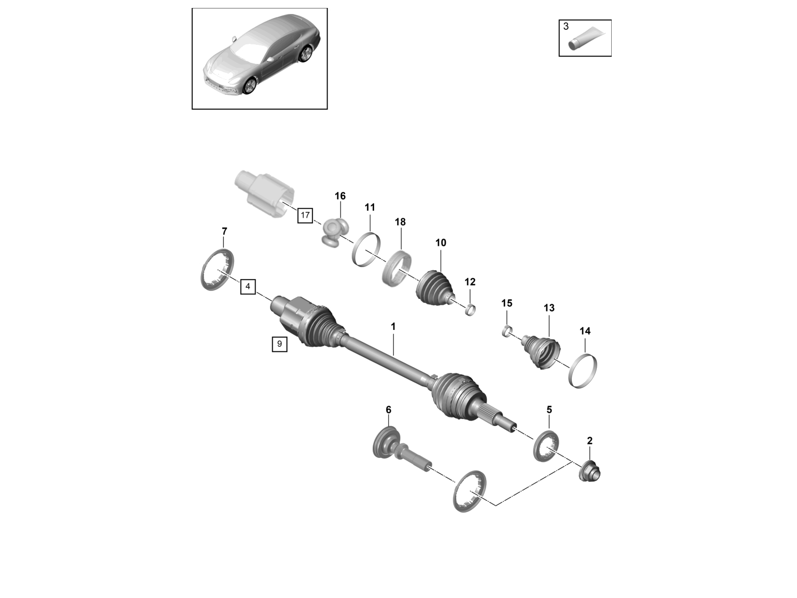 Original Porsche Antriebswelle (OE), auch bekannt als Gleichlaufgelenk (CV-Gelenk). Sie wird nach exakten Porsche-Werksvorgaben gefertigt und kommt bei ausgewählten modernen Porsche 971- und 976-Panamera-Modellen als Teil des Antriebsstrangs zum Einsatz. Sie gewährleistet eine präzise Drehmomentübertragung und einen ruhigen Fahrbetrieb.
