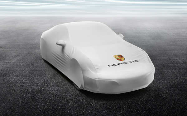 Passgenaue Indoor-Fahrzeugabdeckung aus atmungsaktivem, antistatischem und schmutzabweisendem Material. Mit farbigem Porsche Wappen und „PORSCHE“ Schriftzug.