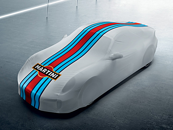 Passgenaue Indoor-Fahrzeugabdeckung aus atmungsaktivem, antistatischem Material im Martini Racing Design.
