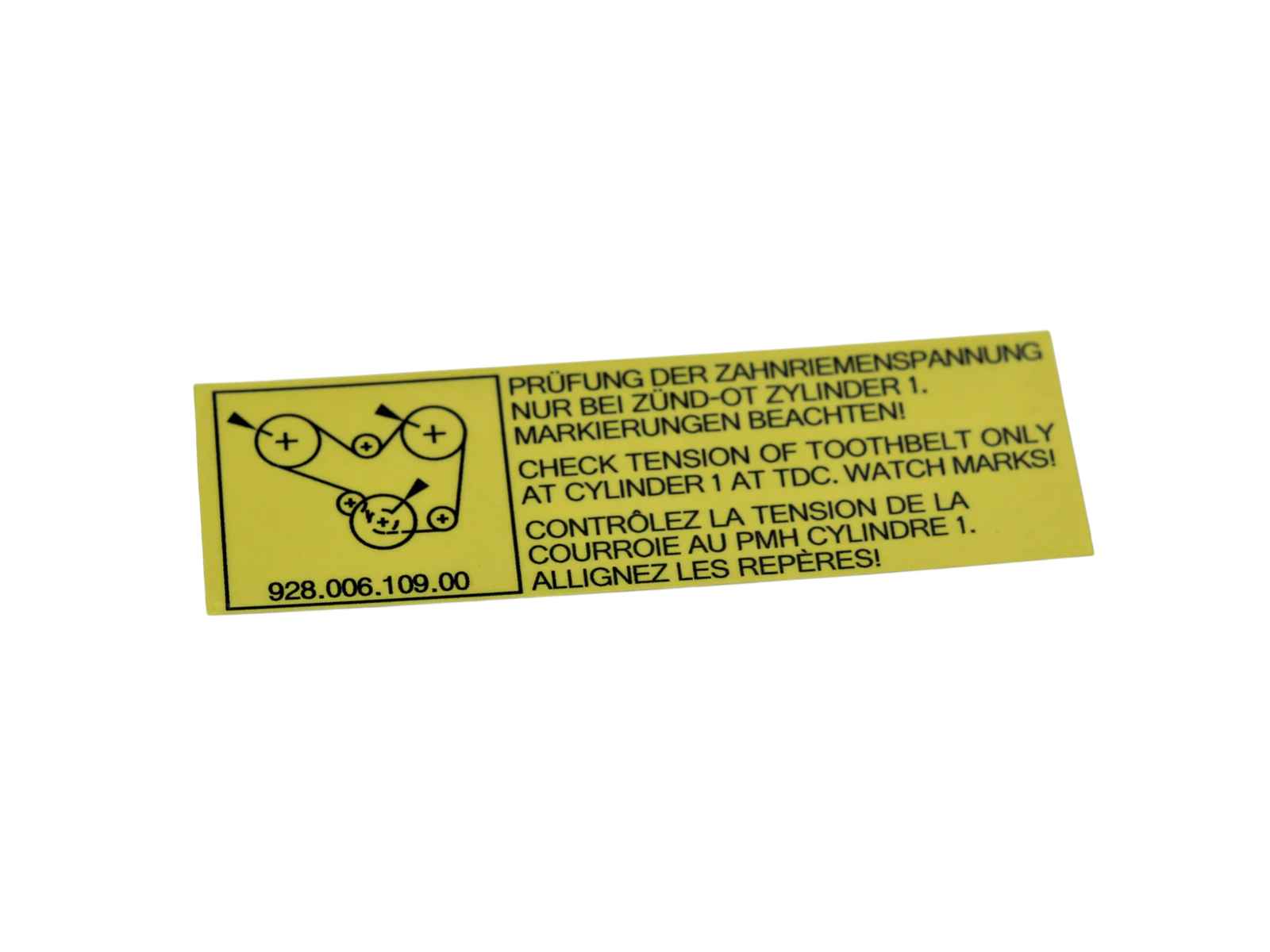Hochwertige Reproduktion des Aufklebers „Zahnriemenspannung prüfen“, passend für Porsche 928 Modelle bis Baujahr 1986.