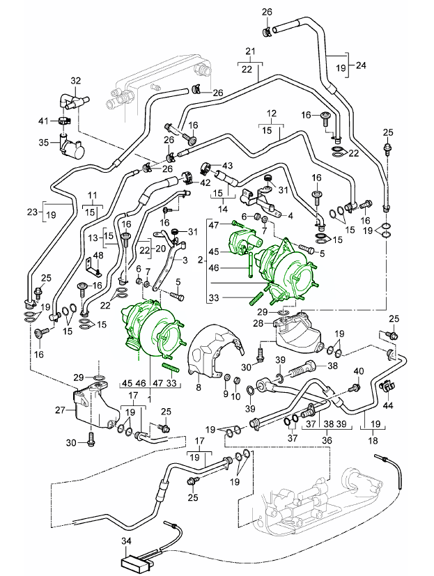 - Turbolader, Ladeluftkühler und zugehörige Teile für Porsche-Modelle.