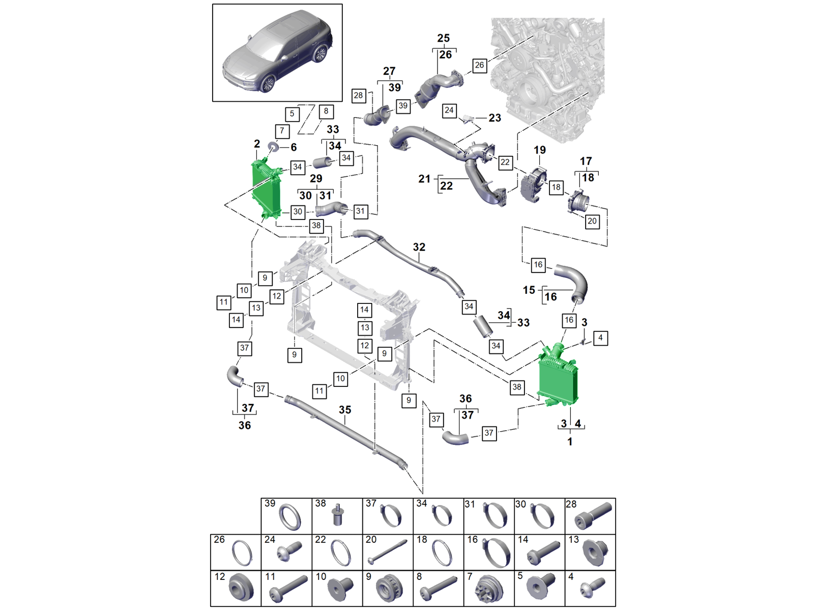 - Turbolader, Ladeluftkühler und zugehörige Teile für Porsche-Modelle.