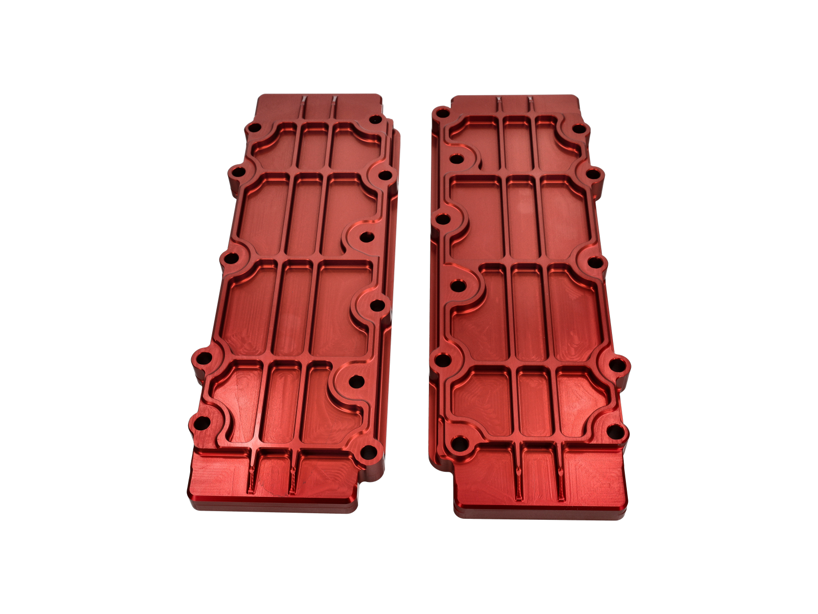 Tapas inferiores del árbol de levas, fabricadas en aleación de aluminio CNC. Anodizadas en rojo.