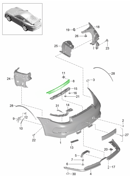 Accesorios, clips y soportes de calidad OEM para una instalación segura y sin vibraciones de rejillas y ventilaciones de parachoques traseros de Porsche.