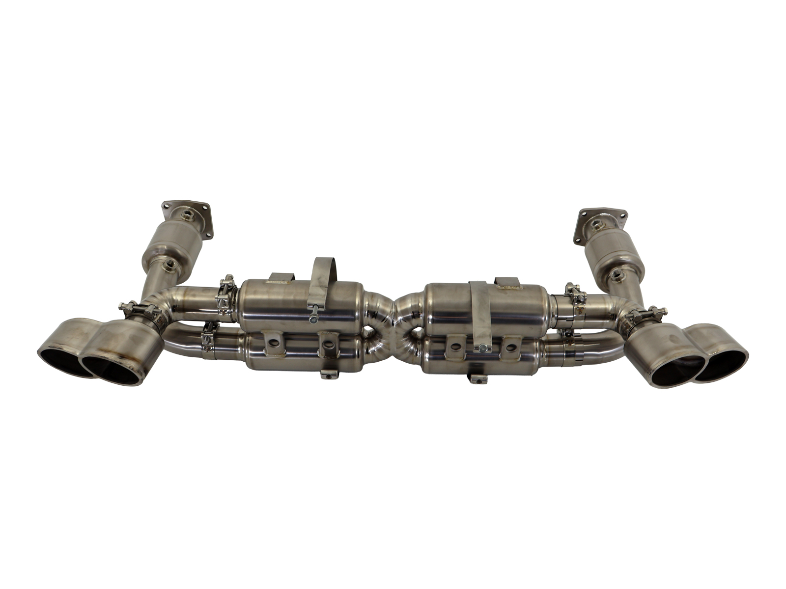 Escape DesignTek 997 Turbo Sport con convertidores catalíticos de ALTO FLUJO de 200 celdas completos con colectores de alto flujo de igual longitud.
