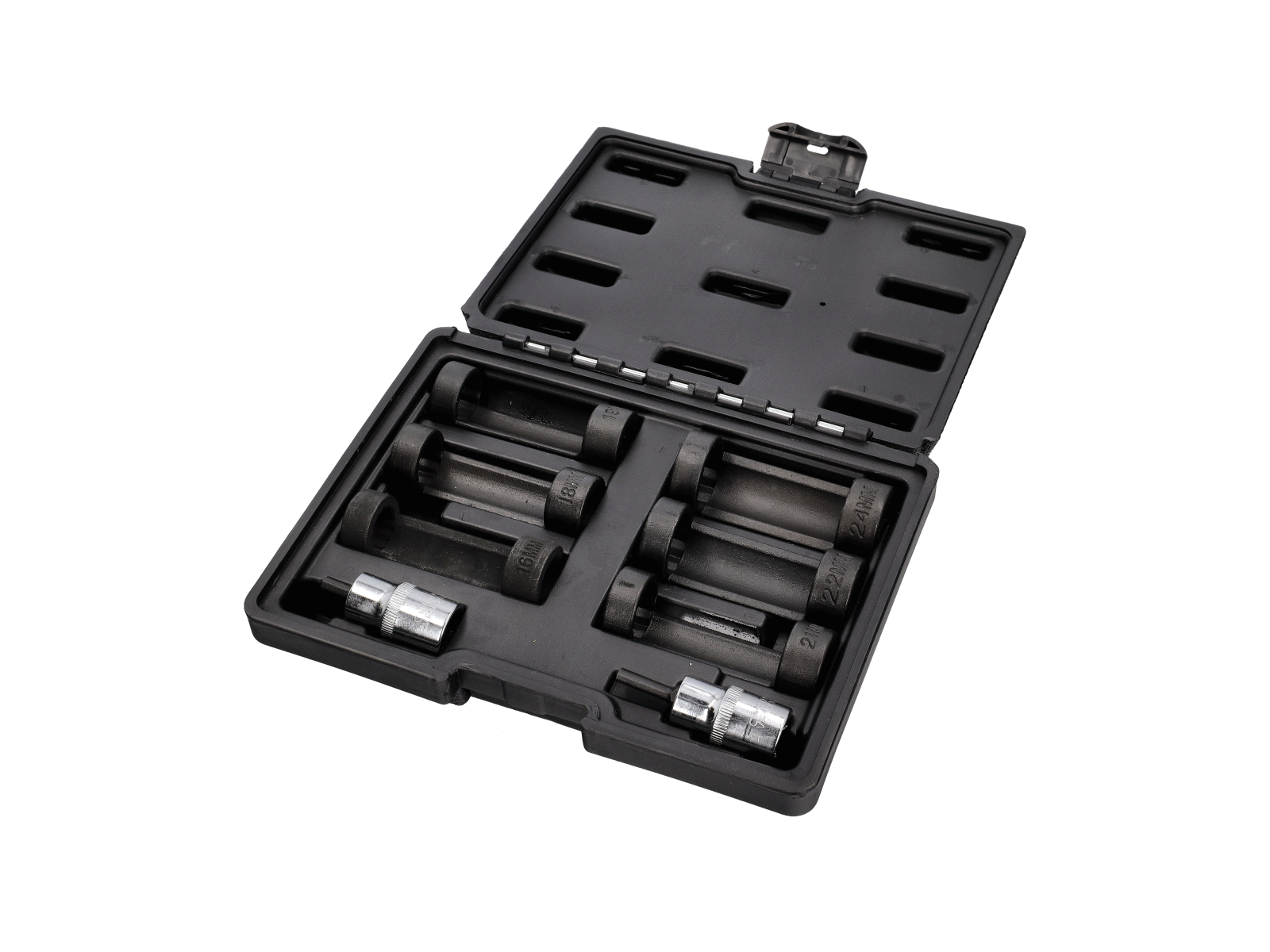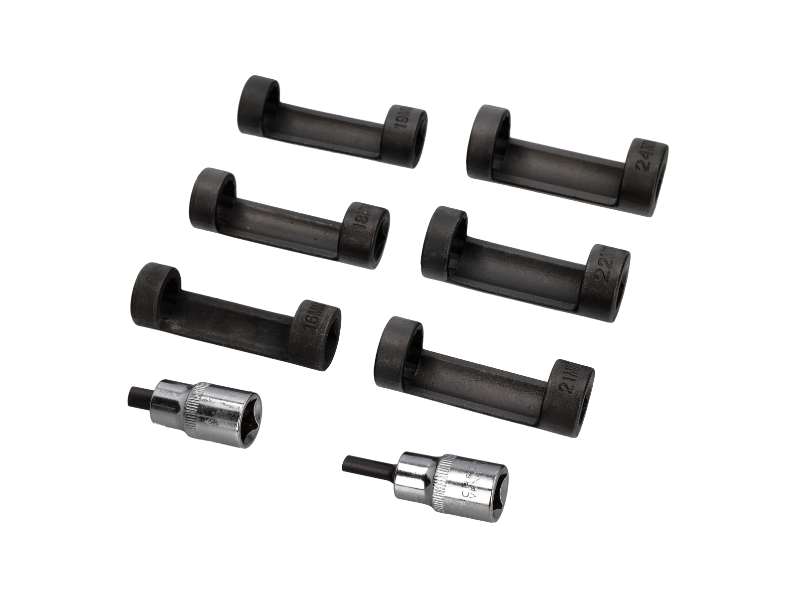 Los conjuntos de puntales suelen requerir vasos especializados para acceder a las tuercas de montaje superior empotradas o parcialmente obstruidas. Este juego de herramientas proporciona el ajuste y la profundidad correctos para evitar deslizamientos, redondeos o daños en la tuerca o el eje del amortiguador durante las reparaciones de la suspensión.