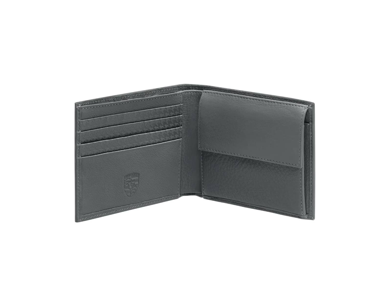 Fina y elegante: la cartera fina con solapa de cuero de vaca de primera calidad convence no solo por su formato compacto y su manejo ligero, sino también por el logotipo "PORSCHE" grabado y una tira textil con aspecto Racing.