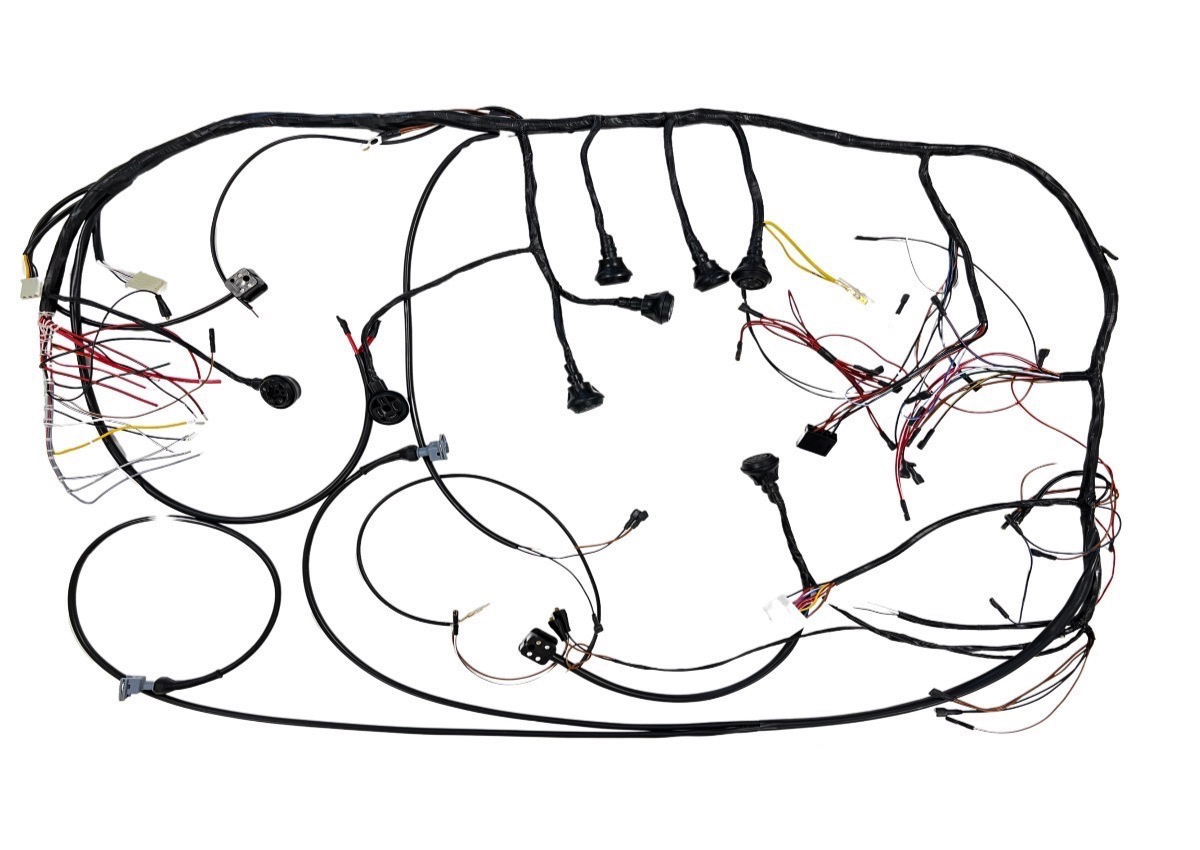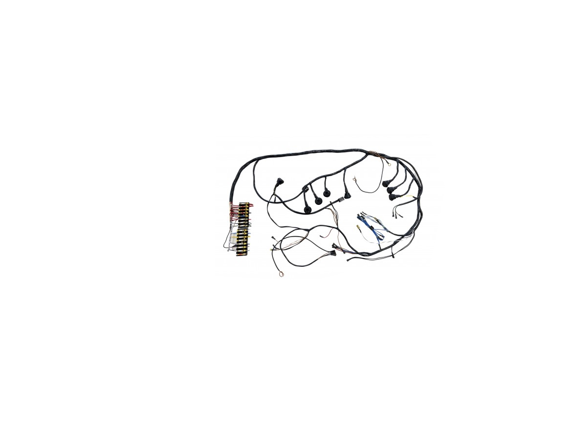Faisceau principal complet avec câblage d'origine, code couleur. Il relie la boîte à fusibles avant au tableau de bord. Ce faisceau s'adapte parfaitement à l'original, tout comme le tube de câblage et le ruban adhésif résistant à l'huile. Les bornes sont équipées de manchons en caoutchouc. Le faisceau est fourni avec des instructions de connexion détaillées.
