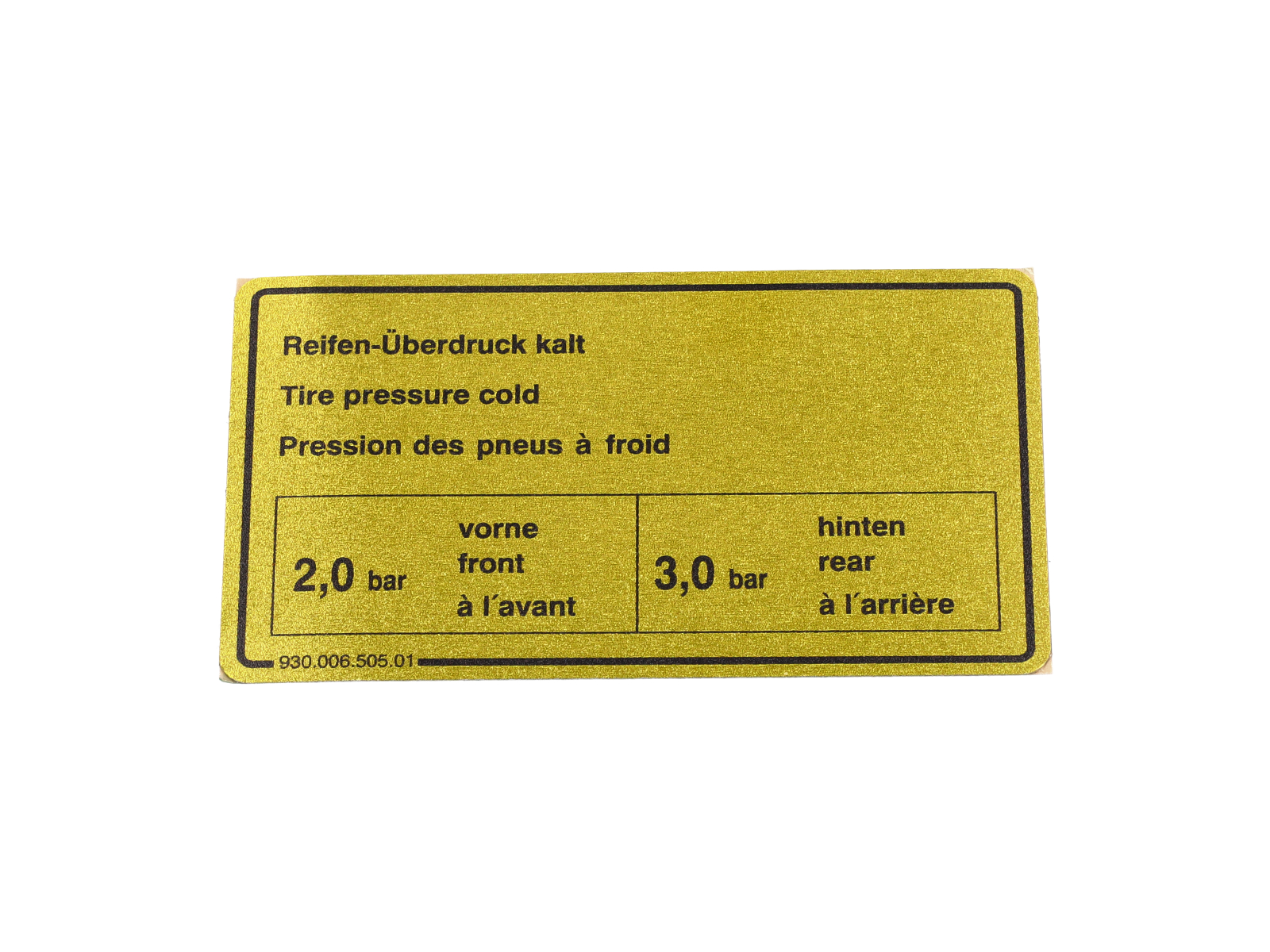 Les autocollants pour pneus sont des étiquettes d'identification et d'information essentielles, apposées sur les véhicules Porsche. Ils indiquent la pression, les dimensions et les spécifications des pneus recommandées. Ils jouent un rôle essentiel dans l'entretien et la performance des pneus, tout en contribuant à l'authenticité de l'intérieur, du coffre ou du montant de porte de votre Porsche. Que vous restauriez un modèle classique ou que vous entreteniez un modèle moderne, un autocollant pour pneu clair et précis est à la fois fonctionnel et esthétique.