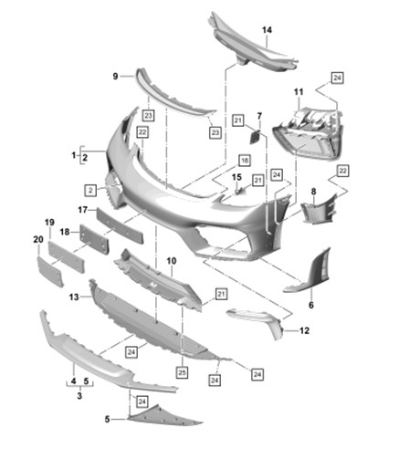 Comprend toutes les grilles, la grille, le becquet inférieur, les conduits d'air, le support de plaque d'immatriculation et les fixations.