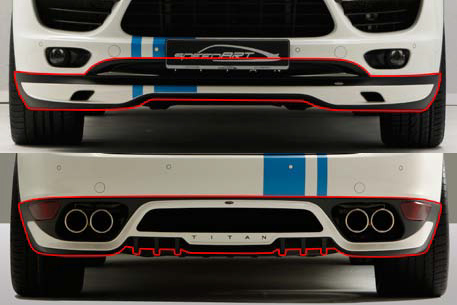 Per il montaggio sulla minigonna posteriore originale (compatibile con gancio traino), parafanghi allargati con mascherina anteriore integrata e presa d'aria posteriore integrata, rivestimento delle portiere anteriore e posteriore con minigonne laterali integrate. Solo per veicoli con paraurti anteriore Turbo-Look.