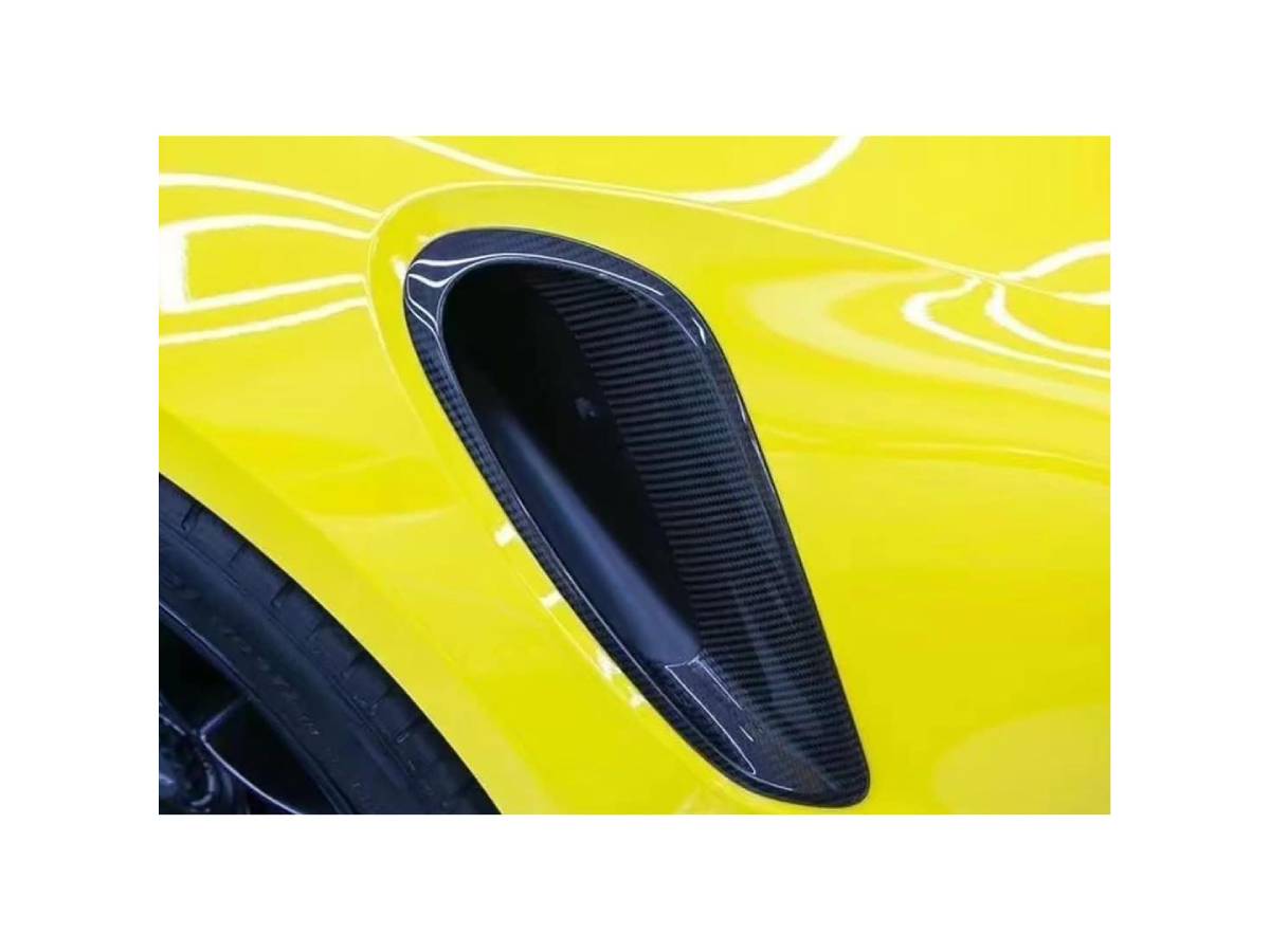 Questo prodotto è una coppia di coperture per le prese d'aria posteriori per la gamma Porsche 911 (992), realizzate o realizzate in vera fibra di carbonio. Queste prese d'aria sono posizionate sui pannelli posteriori e fanno parte del sistema di aspirazione funzionale della 992, alimentando l'aria di raffreddamento al motore o agli intercooler a seconda della variante di modello (ad esempio, Carrera, Turbo, Turbo S).
