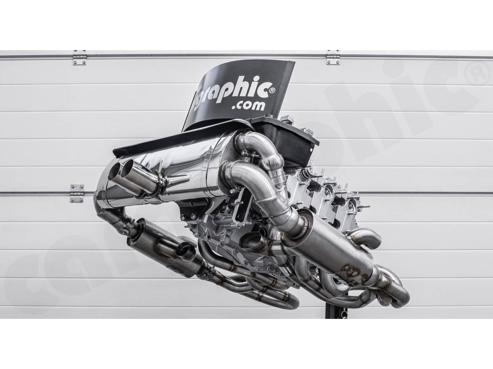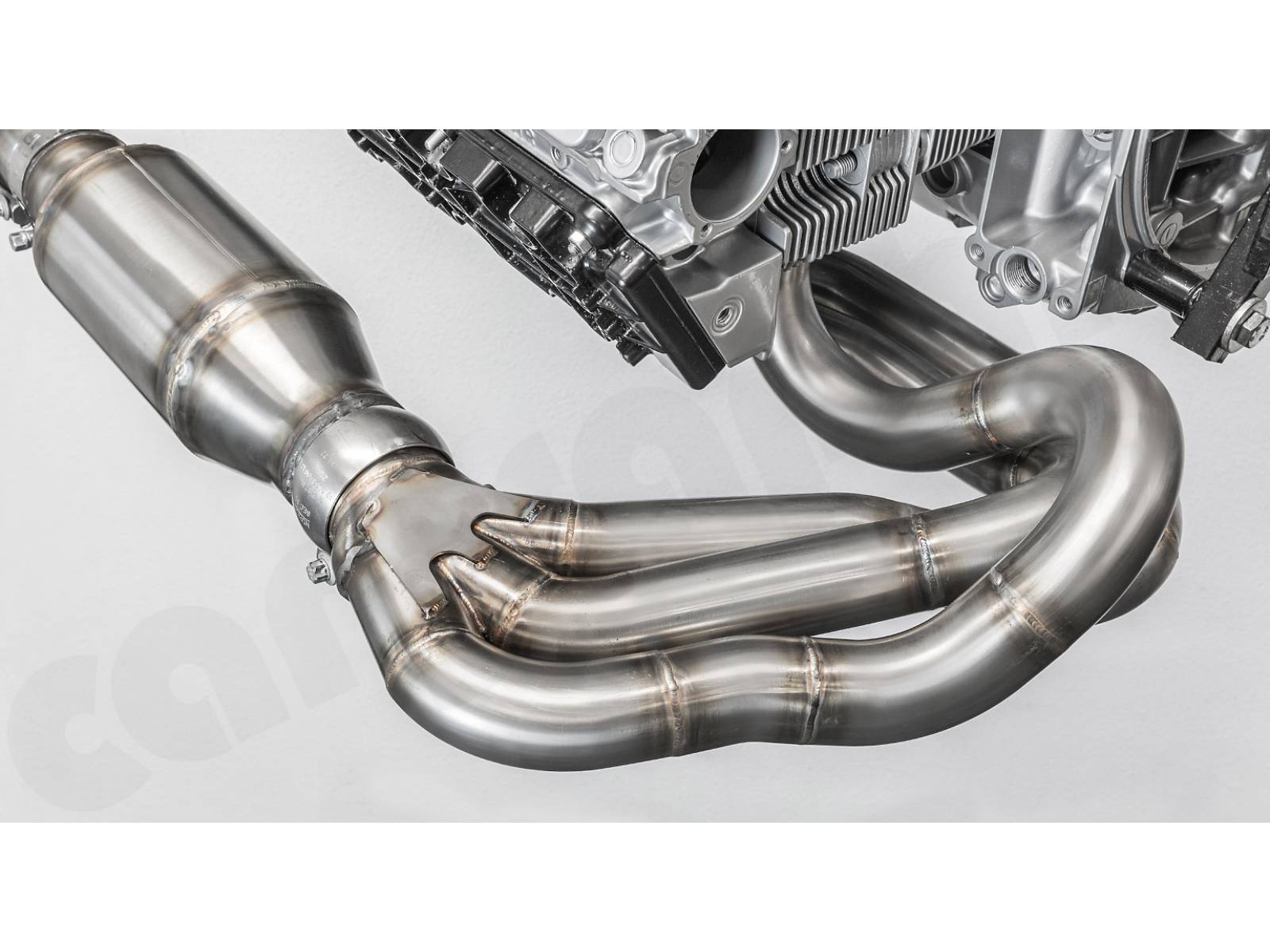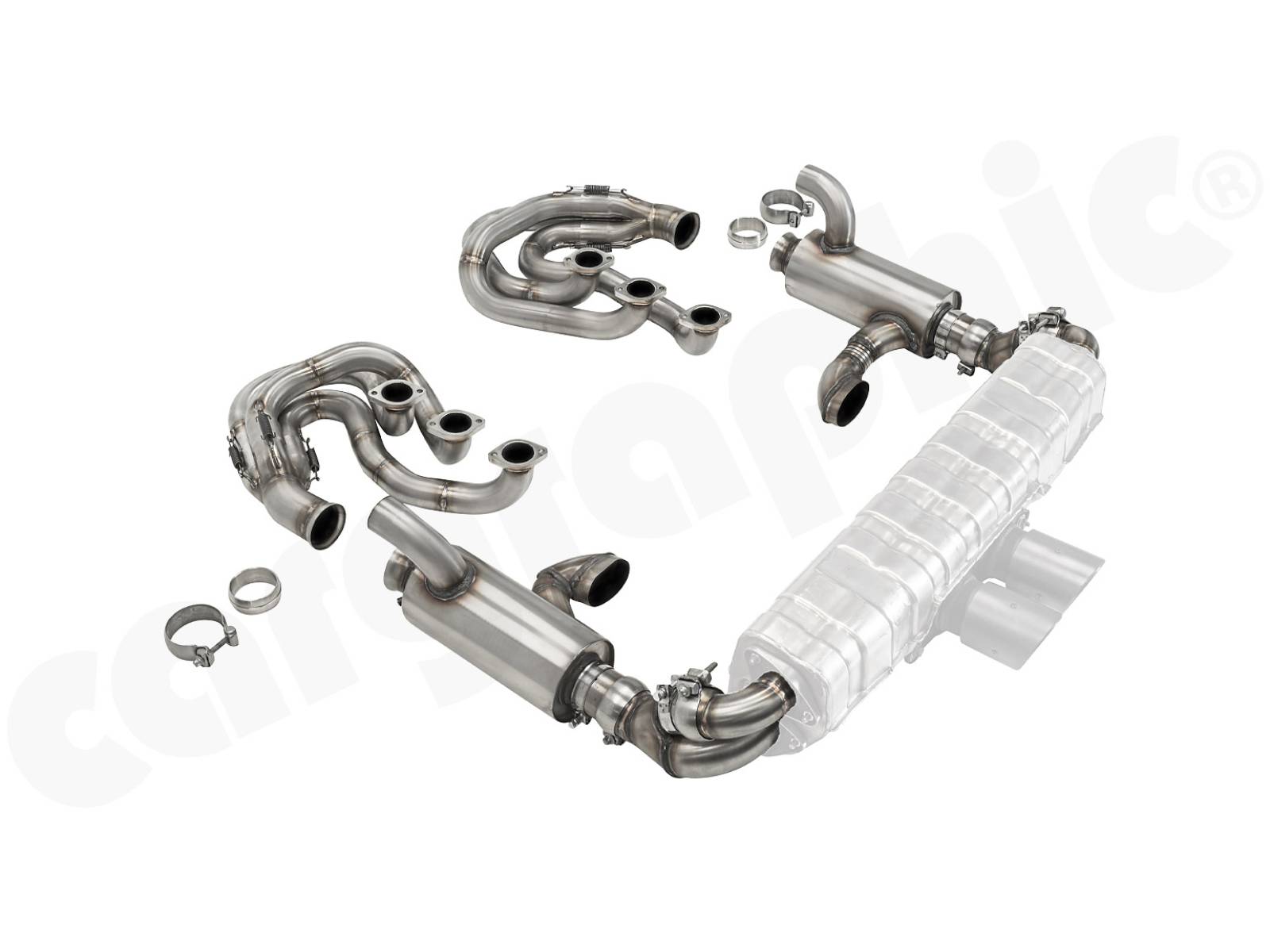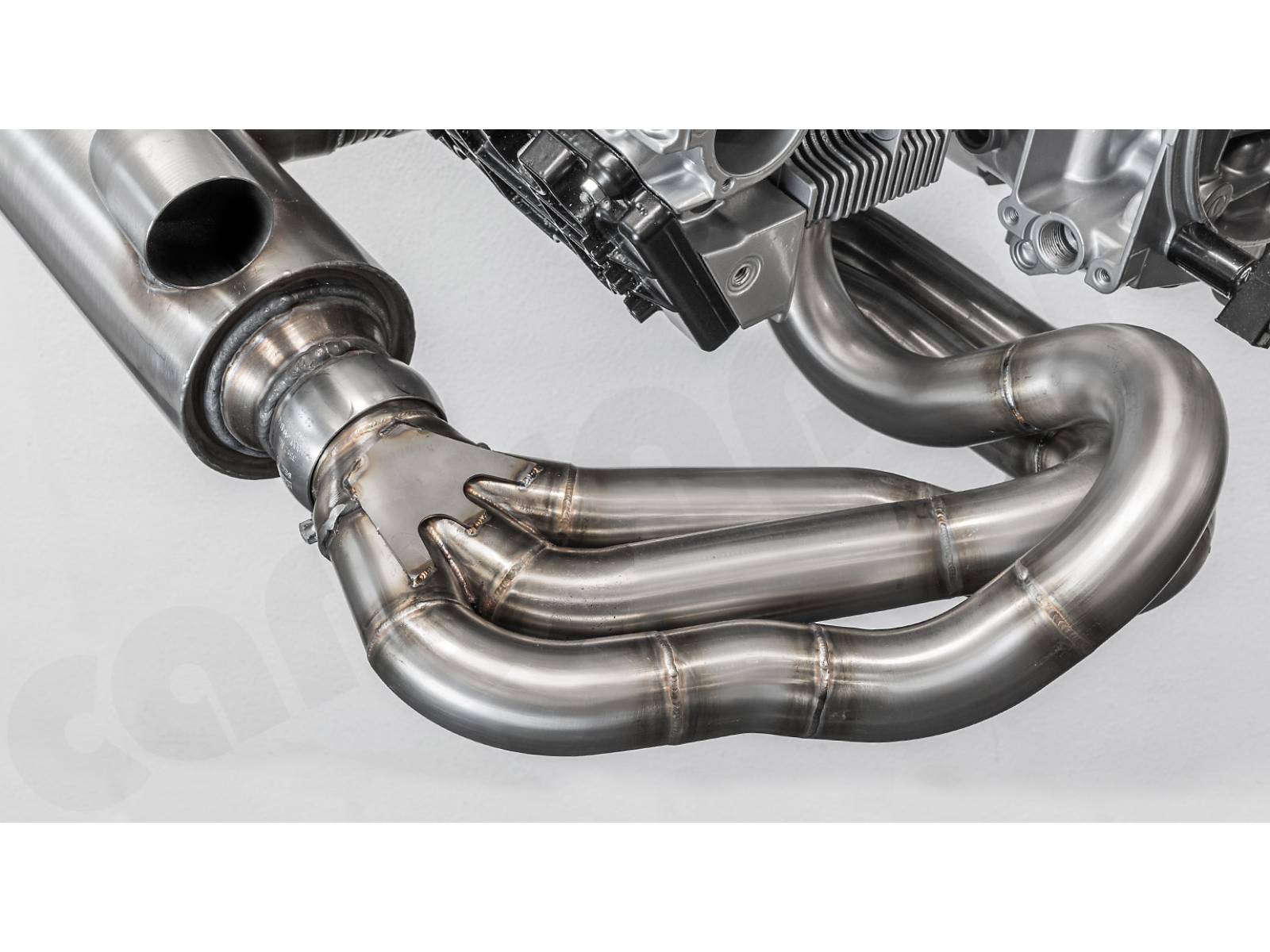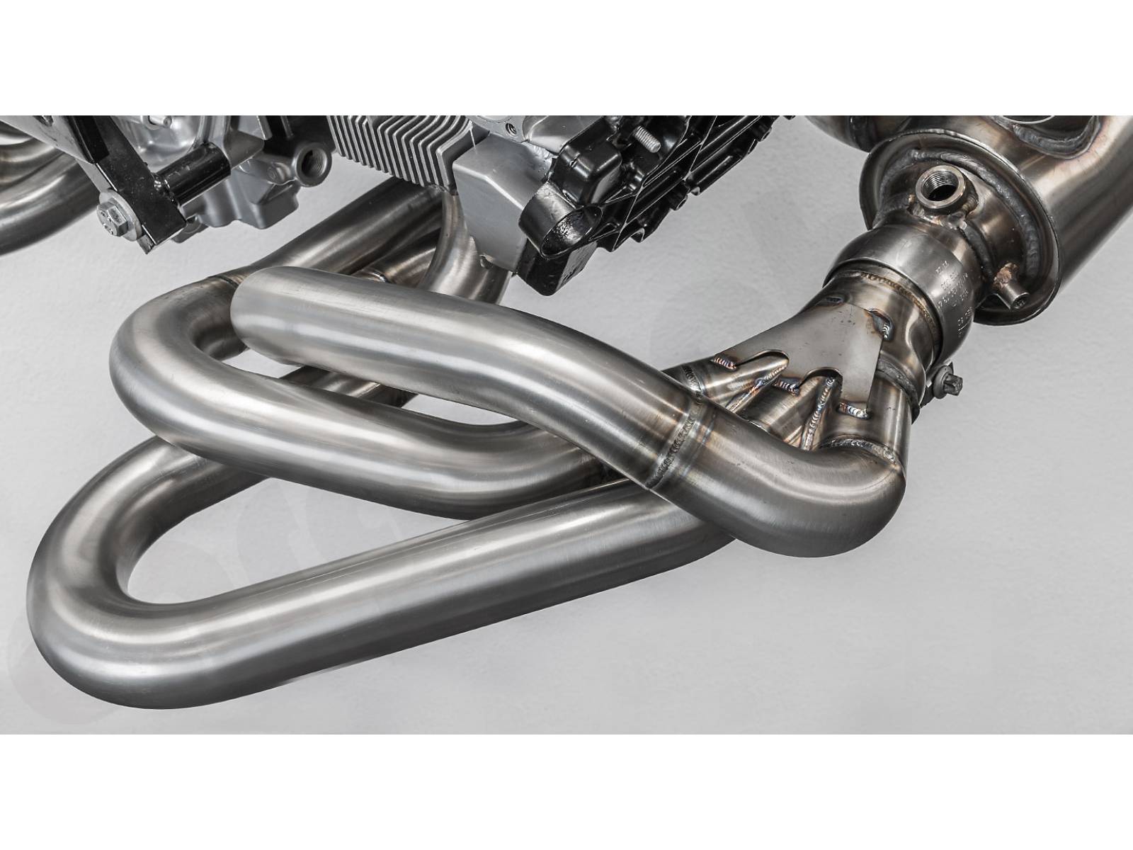 Sistema di scarico sportivo CARGRAPHIC GT Backdate con set collettore ID45 GT, con/senza convertitori catalitici 2x200cpsi, con riscaldamento e valvole di scarico - da utilizzare con silenziatore posteriore OEM GT3.