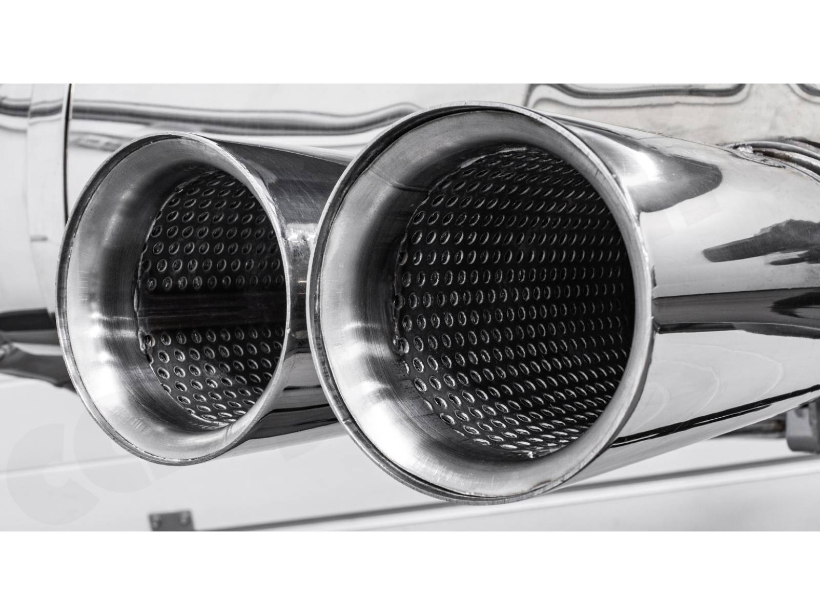 - Set tubi di collegamento CARGRAPHIC con / senza 2 convertitori catalitici HF Ø110 mm da 200 cpsi, con riscaldamento Ø130 mm e valvole di scarico integrate chiuse senza pressione (PLC) Silenziatore posteriore sportivo CARGRAPHIC 4>2 flussi con terminali di scarico centrali