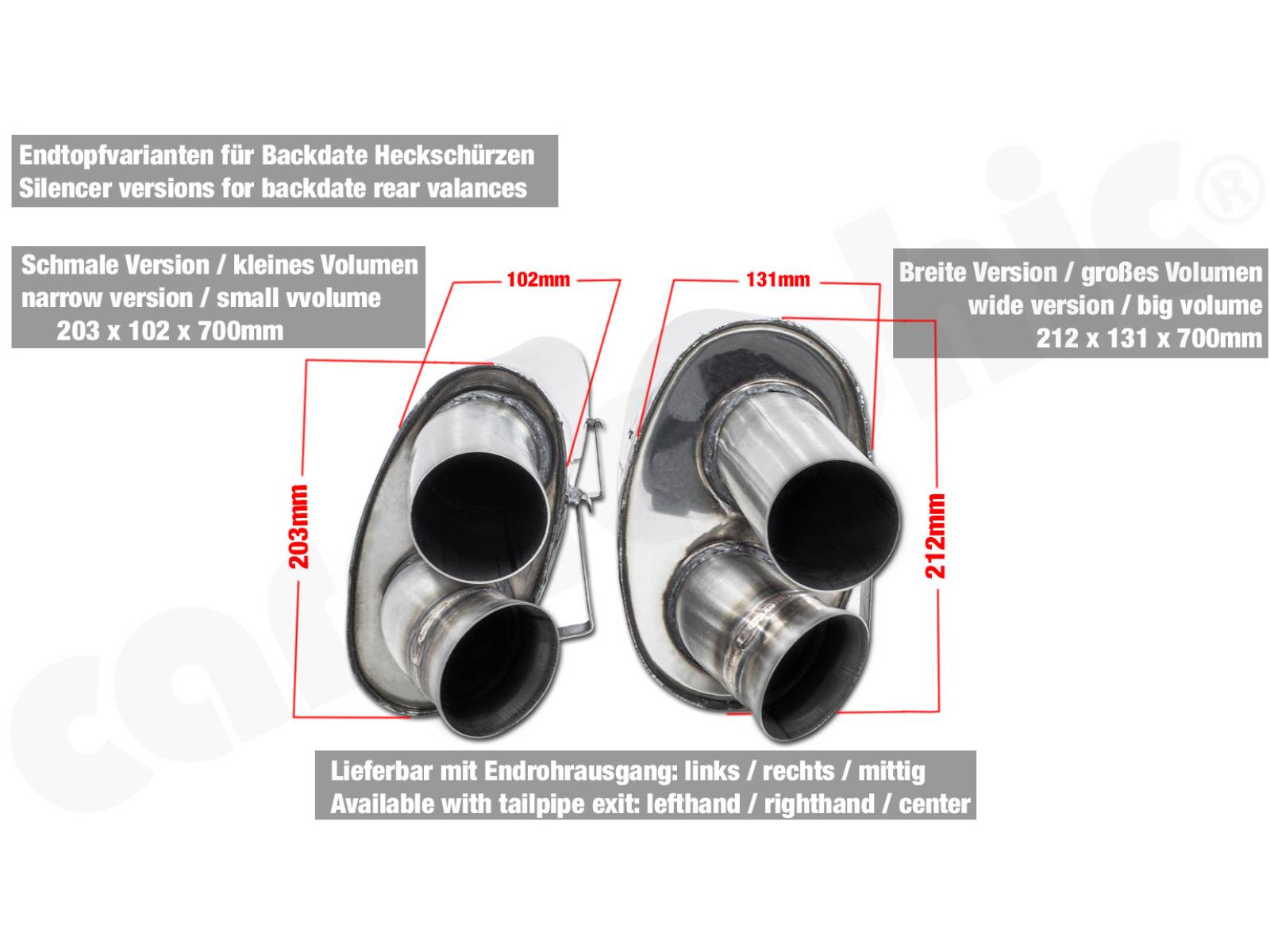 Sistema di scarico sportivo CARGRAPHIC GT Backdate con set collettore ID45 GT, con/senza catalizzatori 2x200cpsi, con riscaldamento e silenziatore posteriore a 4 flussi e 2 uscite centrali, look GT3 2x70mm.